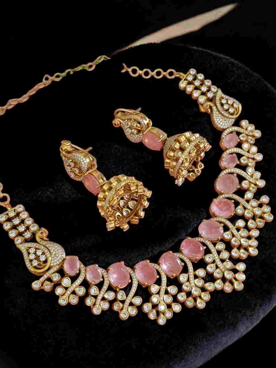 This elegant jewelry set features a gold-plated necklace adorned with pink stones and intricate patterns of small white stones arranged in floral and leaf motifs. The matching earrings complement the necklace with the same pink stones and detailed gold work, creating a cohesive and luxurious look. Ideal for special occasions, this set adds a touch of sophistication and traditional charm to any outfit.