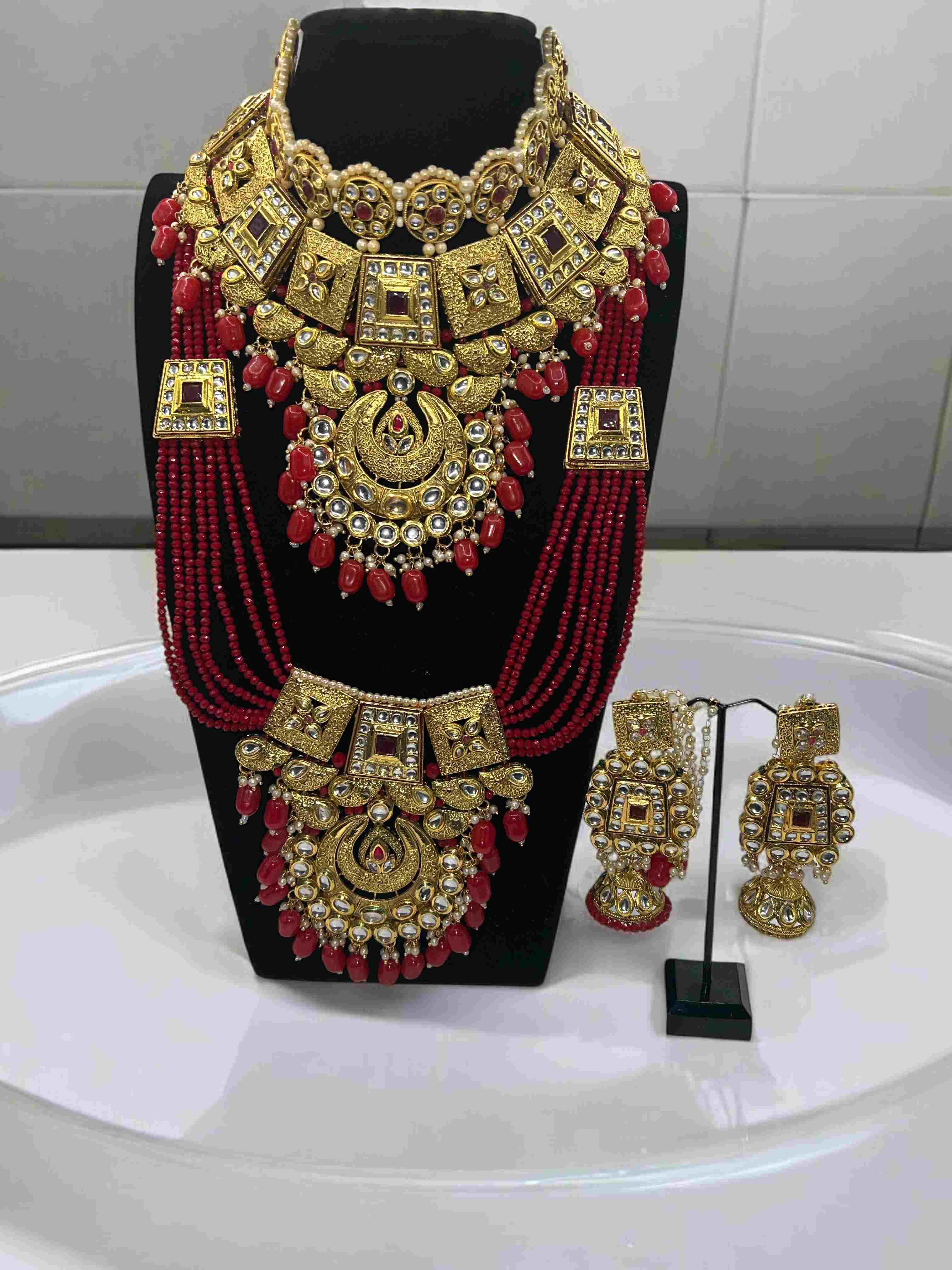 This is an elaborate and ornate traditional Indian bridal jewelry set. The set includes a heavy necklace and a pair of matching earrings. The necklace features intricate gold work with embedded gemstones, primarily red and white stones. The design includes multiple layers with detailed patterns, including square and circular motifs, and a prominent crescent-shaped pendant at the center. The necklace is adorned with red bead strings that add to its grandeur. The matching earrings mirror the design of the necklace with similar motifs and gemstone embellishments, making the set cohesive and visually striking. This jewelry set is ideal for weddings and special occasions, reflecting the rich cultural heritage and craftsmanship of Indian jewelry.