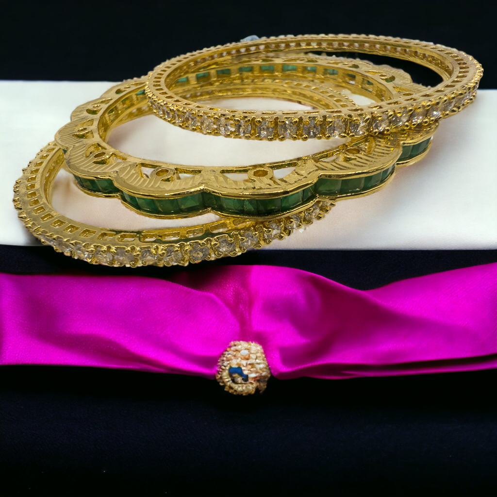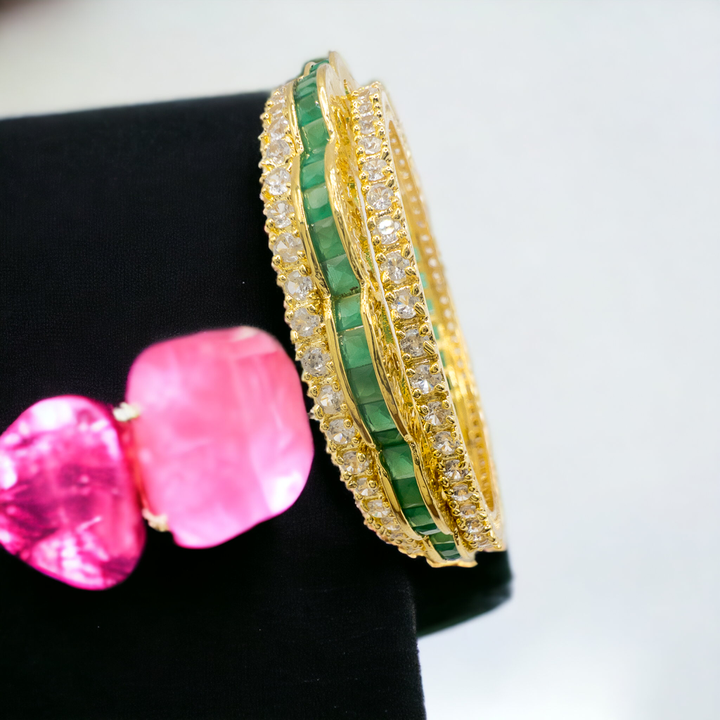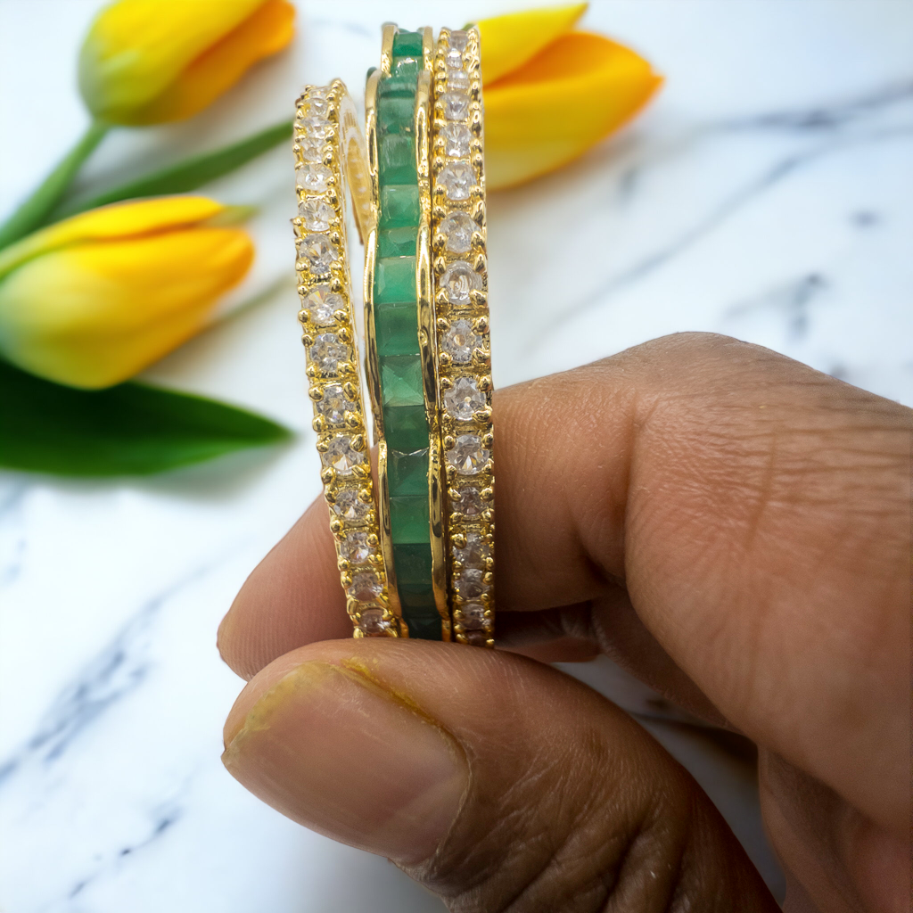 Elevate your wrist with the "Radiant Harmony Set," featuring a combination of diamond-like stone bangles and a captivating green stone bangle. This exquisite set combines the allure of diamond-like stones with the vibrant charm of green, creating a harmonious fusion of luxury and elegance. The intricate designs and sparkling accents add a touch of opulence, making this set a statement ensemble that enhances your style on special occasions. Whether worn individually or stacked, the "Radiant Harmony Set" captures the essence of grace and sophistication, embodying the enchanting allure of both diamond-like brilliance and the captivating vibrancy of green.