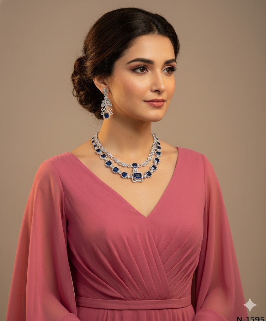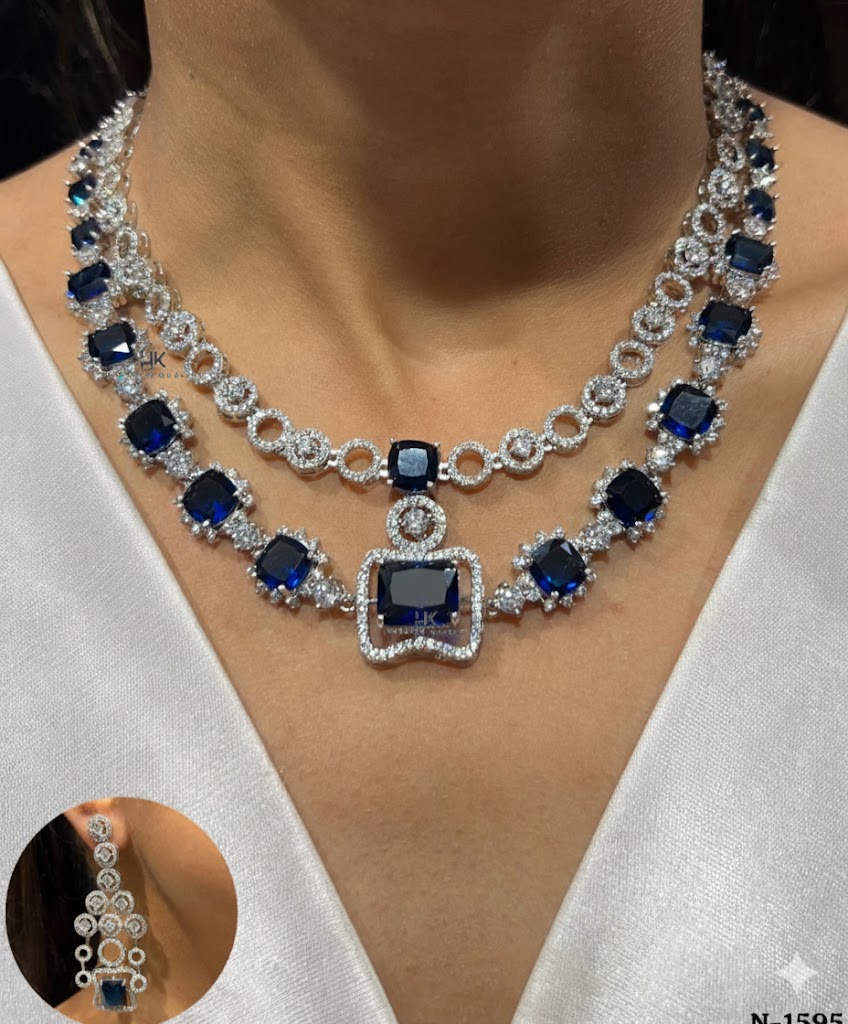 Stunning double-layered cubic zirconia (CZ) necklace and earring set featuring vibrant royal blue cushion-cut stones and brilliant diamond-like accents in a rhodium-plated setting.