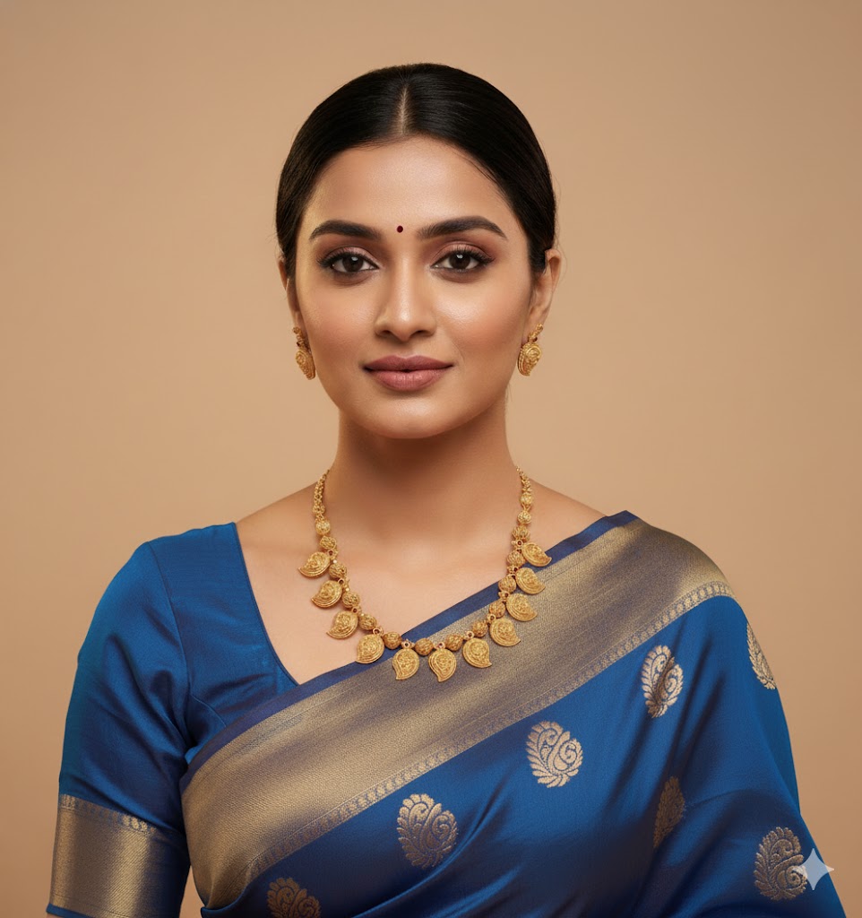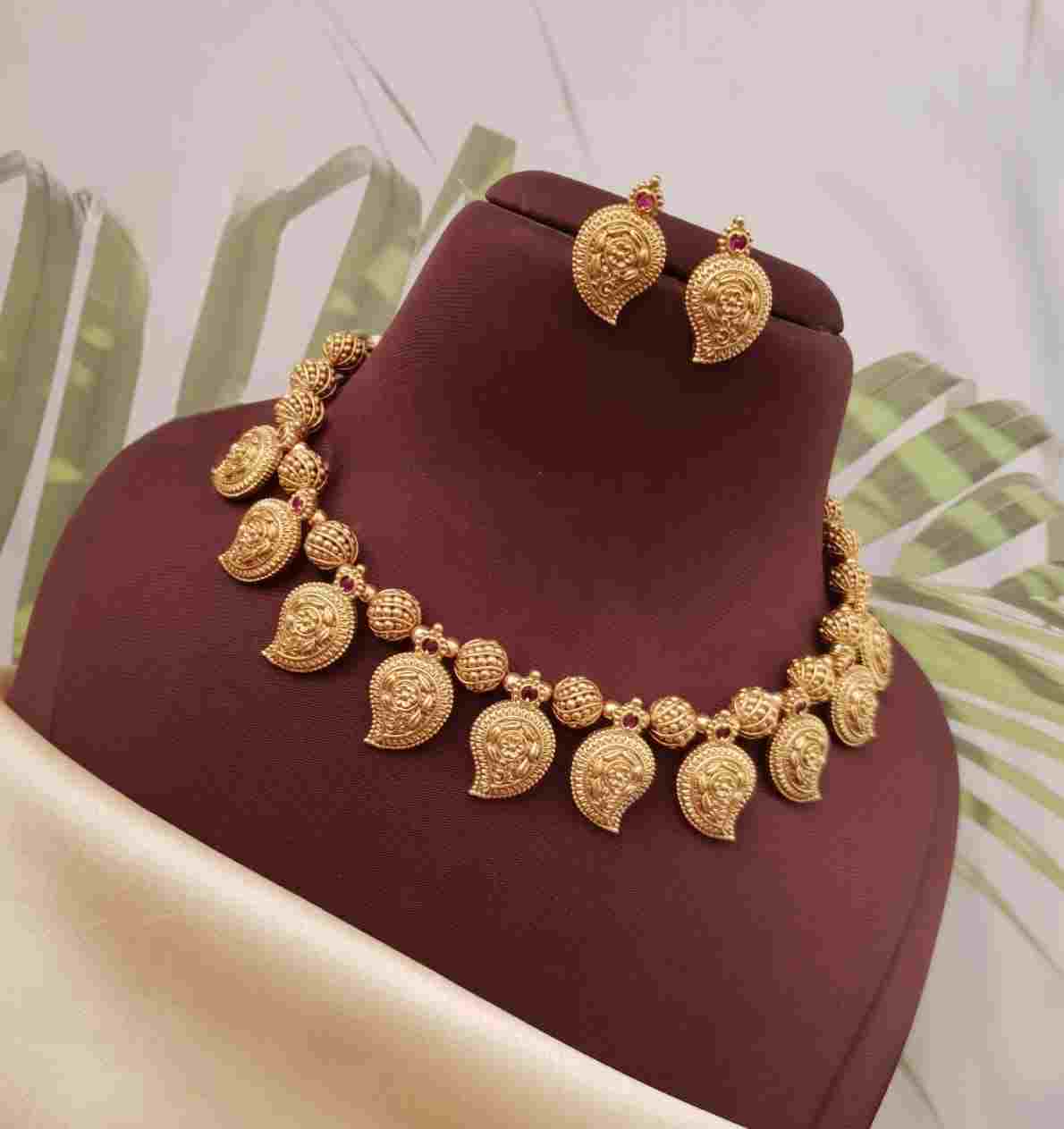 The Traditional Gold Necklace and Earring Set features a series of intricately designed gold pendants, each shaped like a paisley and adorned with detailed engravings. The pendants are interspersed with spherical gold beads, some of which are embedded with small red gemstones. The matching earrings are also paisley-shaped with similar engravings and a single red gemstone at the top. This set stands out for its intricate craftsmanship and traditional design, making it suitable for special occasions and cultural events.