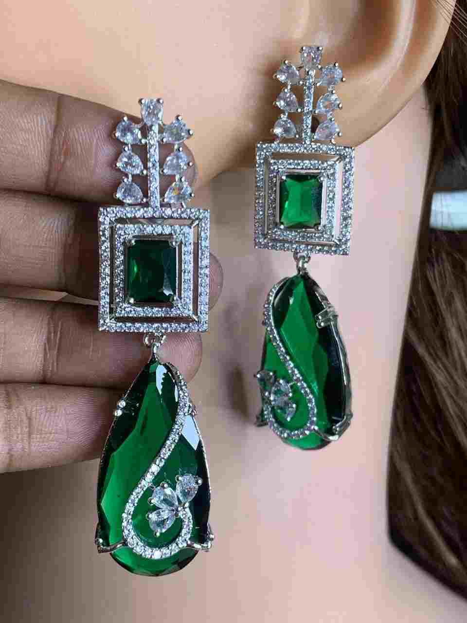 These sophisticated dangle earrings feature a shimmering cluster of marquise and baguette-cut simulated diamonds at the stud, leading to a prominent square-cut Deep Emerald Green gemstone framed by a double halo of sparkling accents. Suspended below is a large, faceted teardrop-shaped Deep Emerald Green gemstone, beautifully adorned with a swirling pave diamond motif and delicate floral accents. Set in a brilliant silver-toned plating, these earrings offer a luxurious statement perfect for special occasions or adding a touch of glamour to your ensemble.