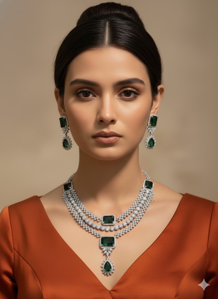 This exquisite jewelry set features a stunning necklace and matching earrings. The necklace is designed with three layers of sparkling diamonds, each layer adorned with large, rectangular emerald stones set in diamond-encrusted frames. The centerpiece of the necklace is a larger rectangular emerald, from which a teardrop-shaped emerald pendant dangles, also surrounded by diamonds. The matching earrings mirror the design of the necklace, with a rectangular emerald at the top and a teardrop-shaped emerald pendant below, both framed by diamonds. This set is a perfect blend of elegance and luxury, making it an ideal choice for special occasions.