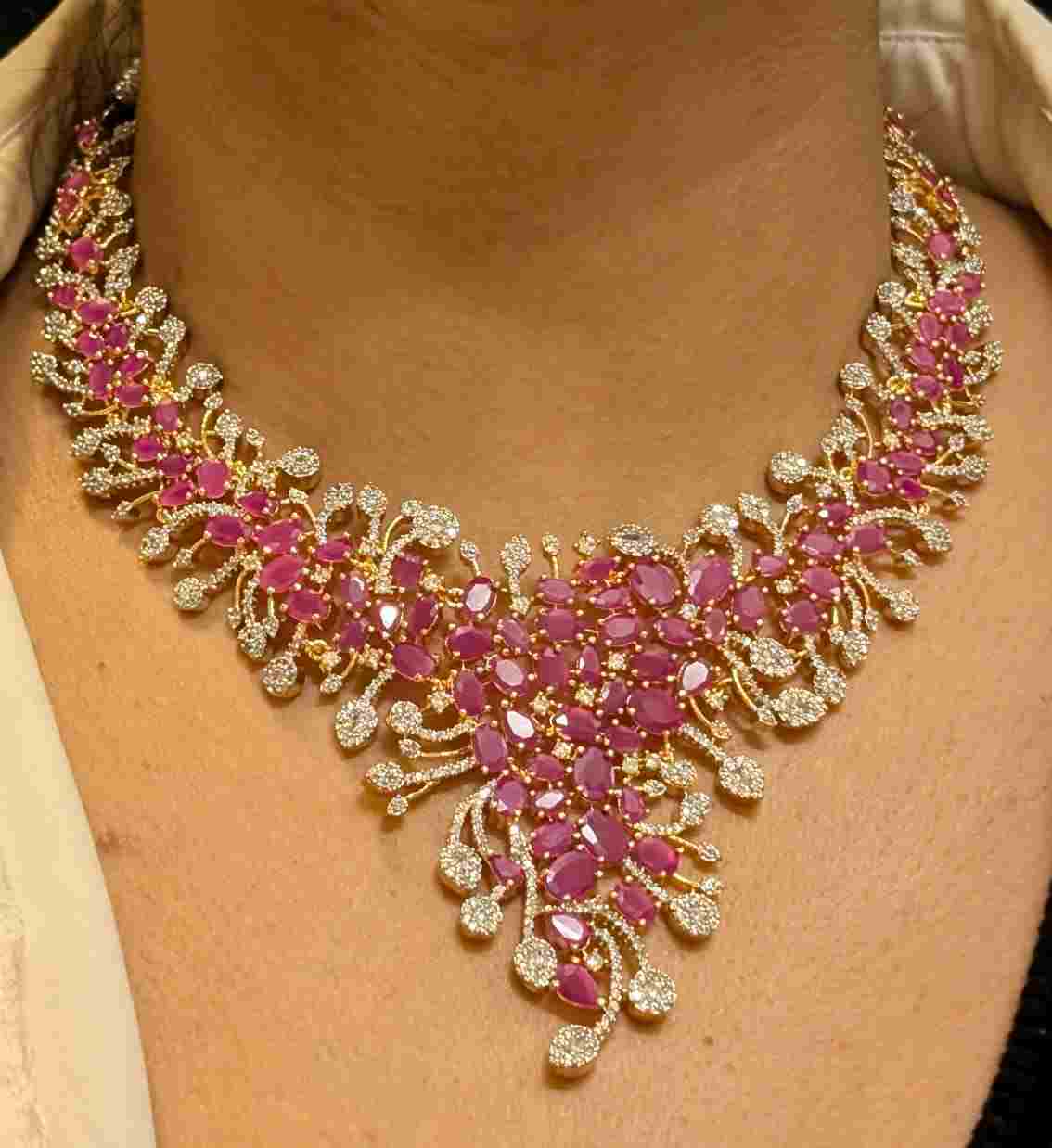 This exquisite necklace showcases a stunning array of pink gemstones, meticulously set in a floral and leaf motif design. Each gemstone is surrounded by intricate gold settings and accented with sparkling diamonds, creating a dazzling effect. The necklace is a statement piece, perfect for special occasions and adding a touch of elegance and luxury to any outfit.