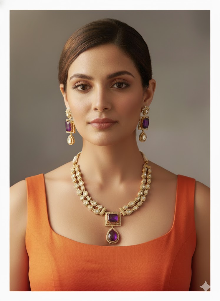Exquisite Amethyst-Tone & Gold-Plated Kundan Jewelry Set (ID # DV1767)