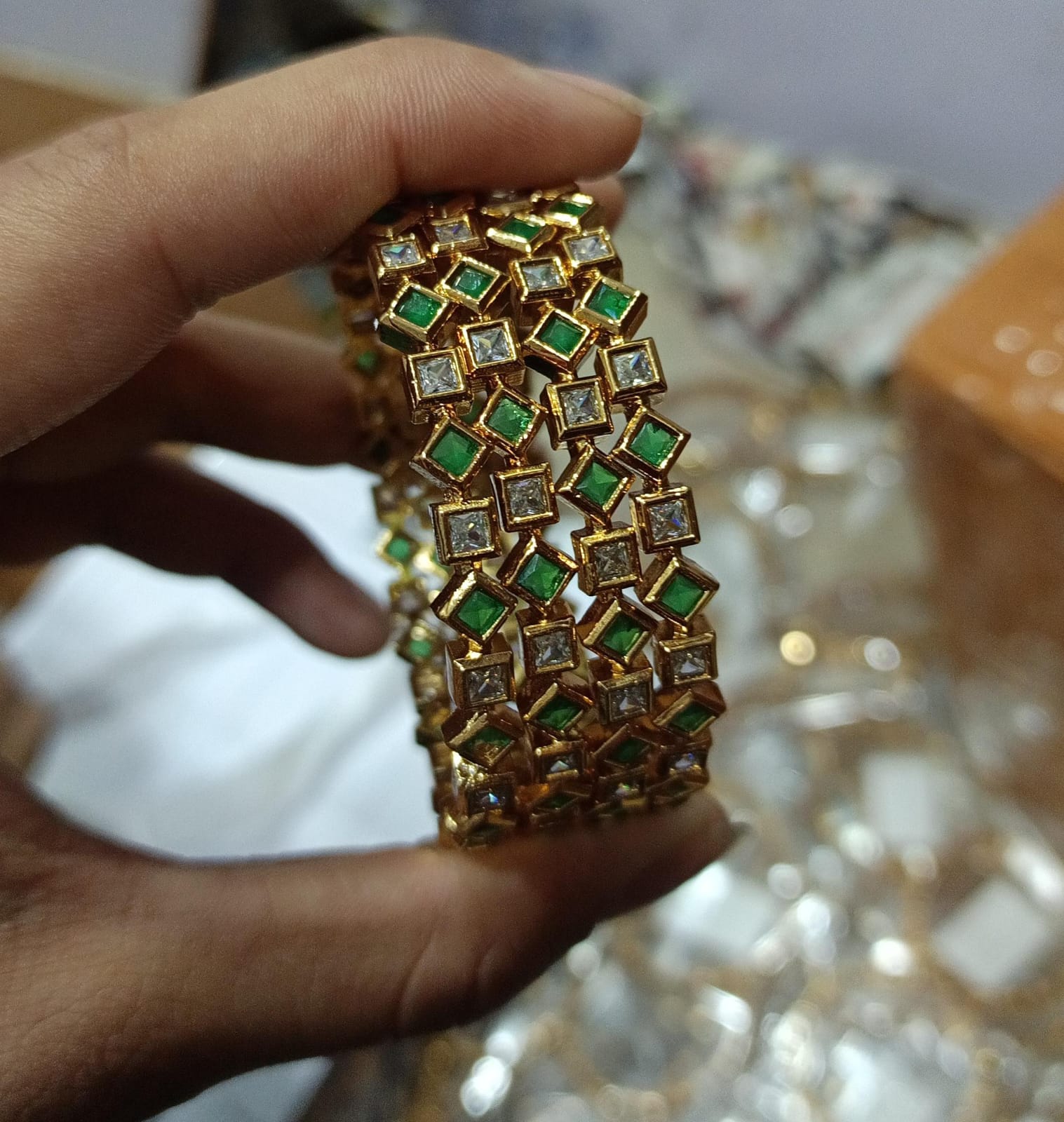 AD-Studded Gold-Plated Bangle Set with Green Gem Accents (ID # DV1750)