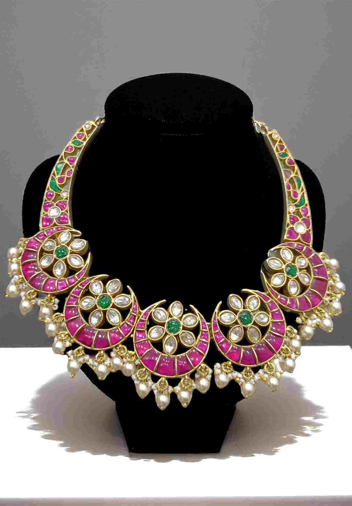 An eye-catching choker featuring bold crescent and floral motifs, richly enameled in vibrant pink and green, accented with sparkling white stones and delicate pearl drops. Perfect for adding a festive pop of color.