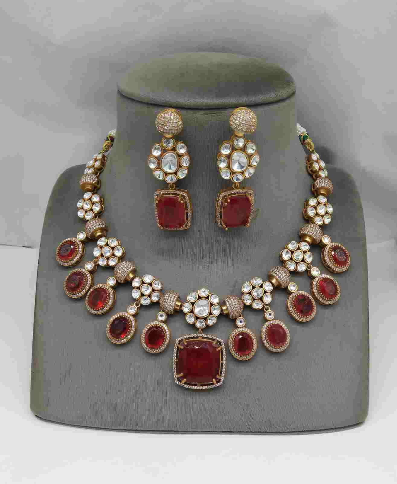 This exquisite jewelry set features a stunning necklace and matching earrings. The necklace is adorned with large, oval-shaped ruby gemstones, each encircled by a halo of smaller diamonds. The centerpiece of the necklace is a larger, square-cut ruby, also surrounded by diamonds. The earrings complement the necklace with a similar design, featuring a cluster of diamonds at the top and a single, rectangular ruby gemstone hanging below. The intricate design and the combination of rubies and diamonds make this set a perfect choice for special occasions, adding a touch of elegance and sophistication to any outfit.