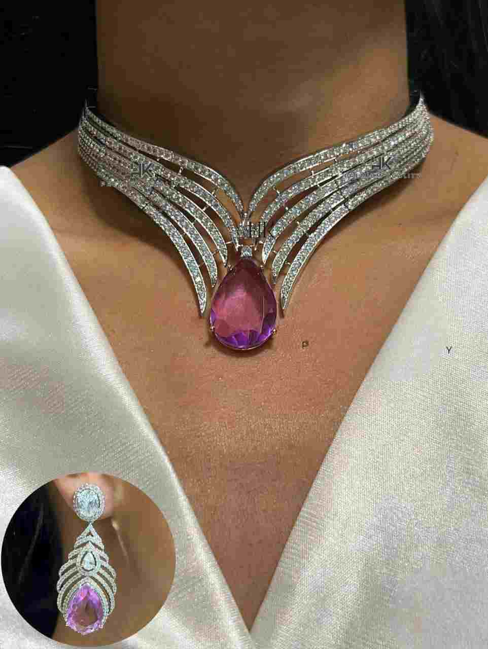 Make a radiant statement with this contemporary and elegant choker necklace and matching earring set. The choker features a dazzling winged design, meticulously adorned with brilliant diamond-like cubic zirconia stones set in a rhodium-plated finish, ensuring maximum sparkle. A magnificent, eye-catching pear-cut gemstone, displaying a beautiful shade of pink-purple (resembling pink amethyst or rose de France quartz), dangles gracefully as the central focal point of the necklace. The accompanying dangle earrings elegantly mirror the winged motif and showcase a matching vibrant pink-purple pear drop, completing this sophisticated and luxurious ensemble. Perfect for glamorous evening events, galas, and any occasion demanding a show-stopping accessory with a unique pop of color.