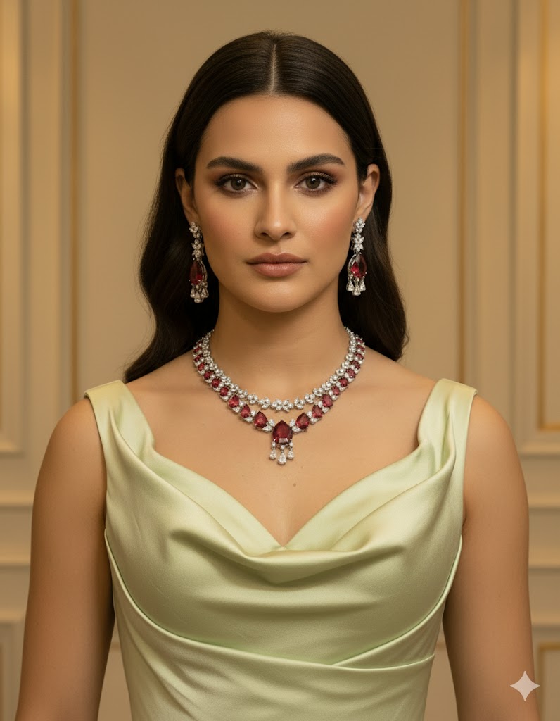 A captivating necklace set featuring rich ruby gemstones elegantly framed by dazzling diamonds. The intricate design showcases a grand teardrop ruby centerpiece, complemented by matching earrings for a regal finish. Perfect for weddings and special occasions.