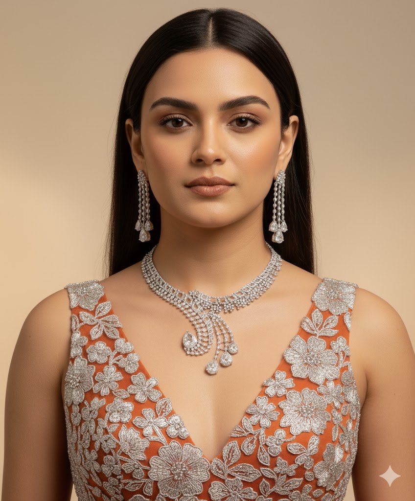 This luxurious jewelry set features an elaborate necklace and matching earrings, both showcasing a stunning design of multiple rows of small diamonds arranged in an intricate lattice pattern. The necklace culminates in larger pear-shaped diamonds, creating a dazzling focal point. The matching earrings have a similar design, with three dangling pear-shaped diamonds that mirror the necklace''s elegance. This set is perfect for special occasions, adding a touch of sophistication and glamour to any outfit.