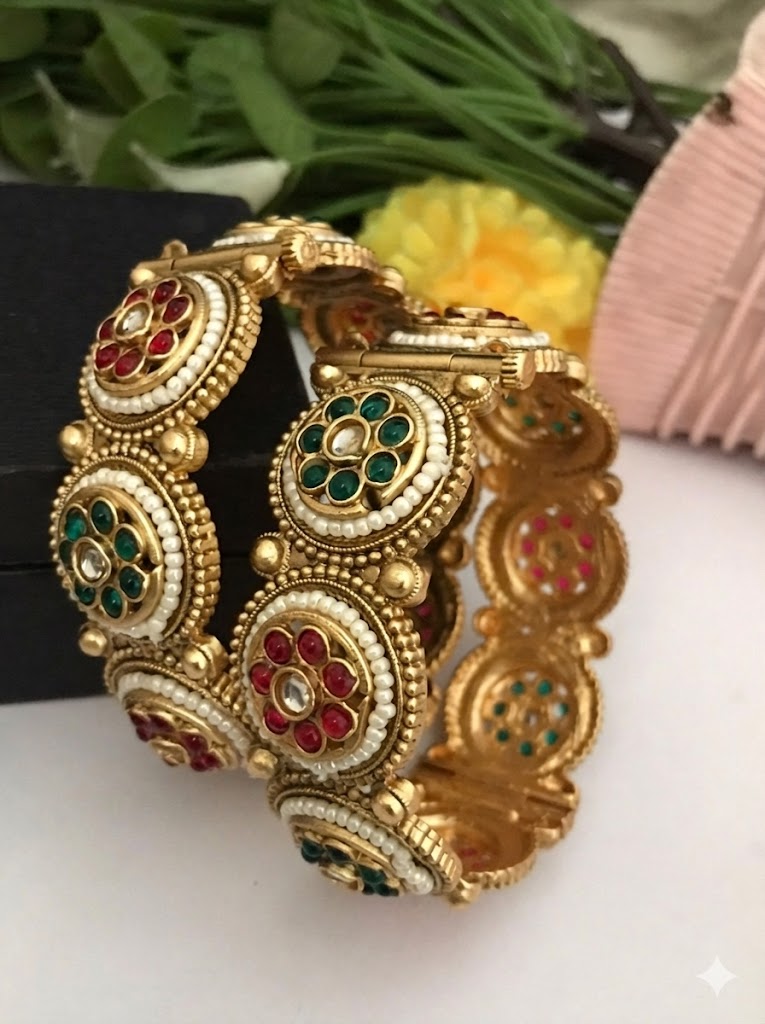 Gold bangles with circular motifs containing red and green stones, edged with pearls. Ideal for Sangeet nights, family functions, or gifting.
