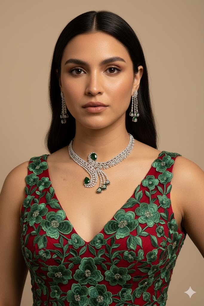 This luxurious jewelry set features a stunning necklace and matching earrings. The necklace is intricately designed with a lattice pattern of small, sparkling diamonds, interspersed with several large, teardrop-shaped green gemstones. The centerpiece of the necklace includes a prominent green teardrop gemstone, surrounded by diamonds, creating a focal point of elegance. The matching earrings are long and dangle gracefully, each consisting of multiple strands of small diamonds that culminate in a green teardrop gemstone, mirroring the necklace''s design. This set is perfect for special occasions, adding a touch of sophistication and glamour to any outfit.