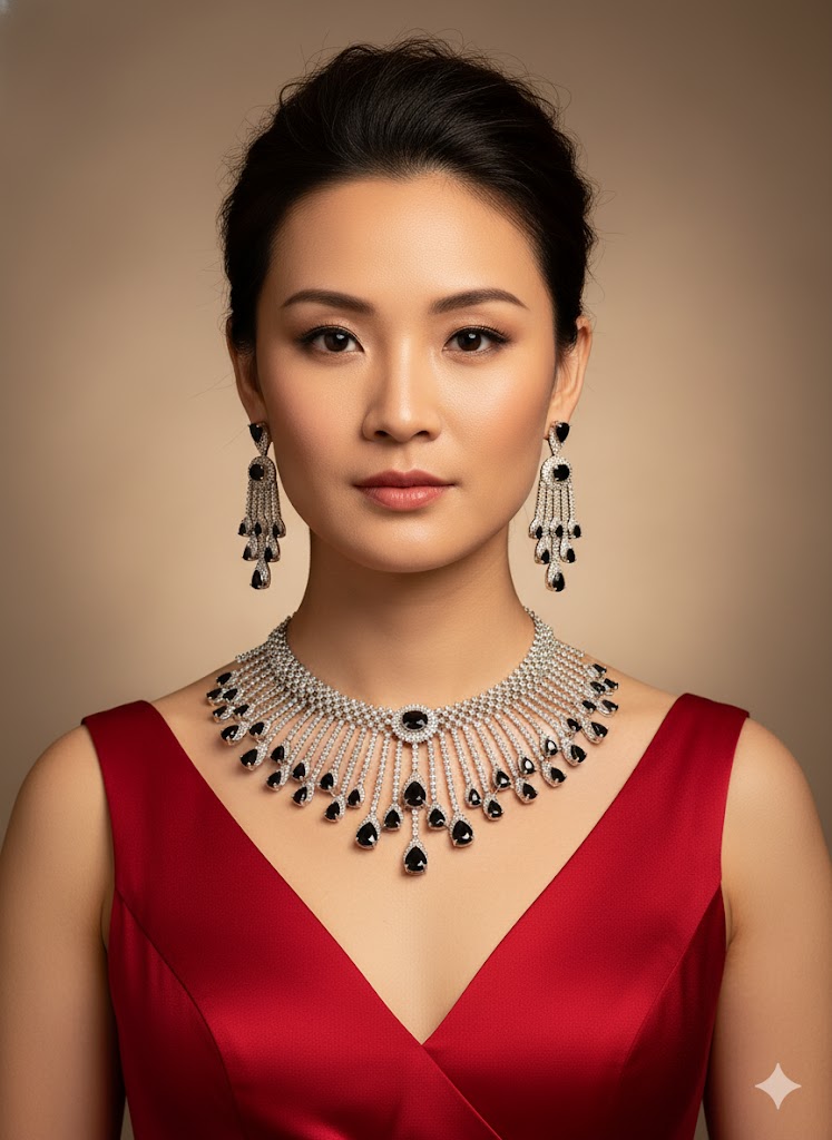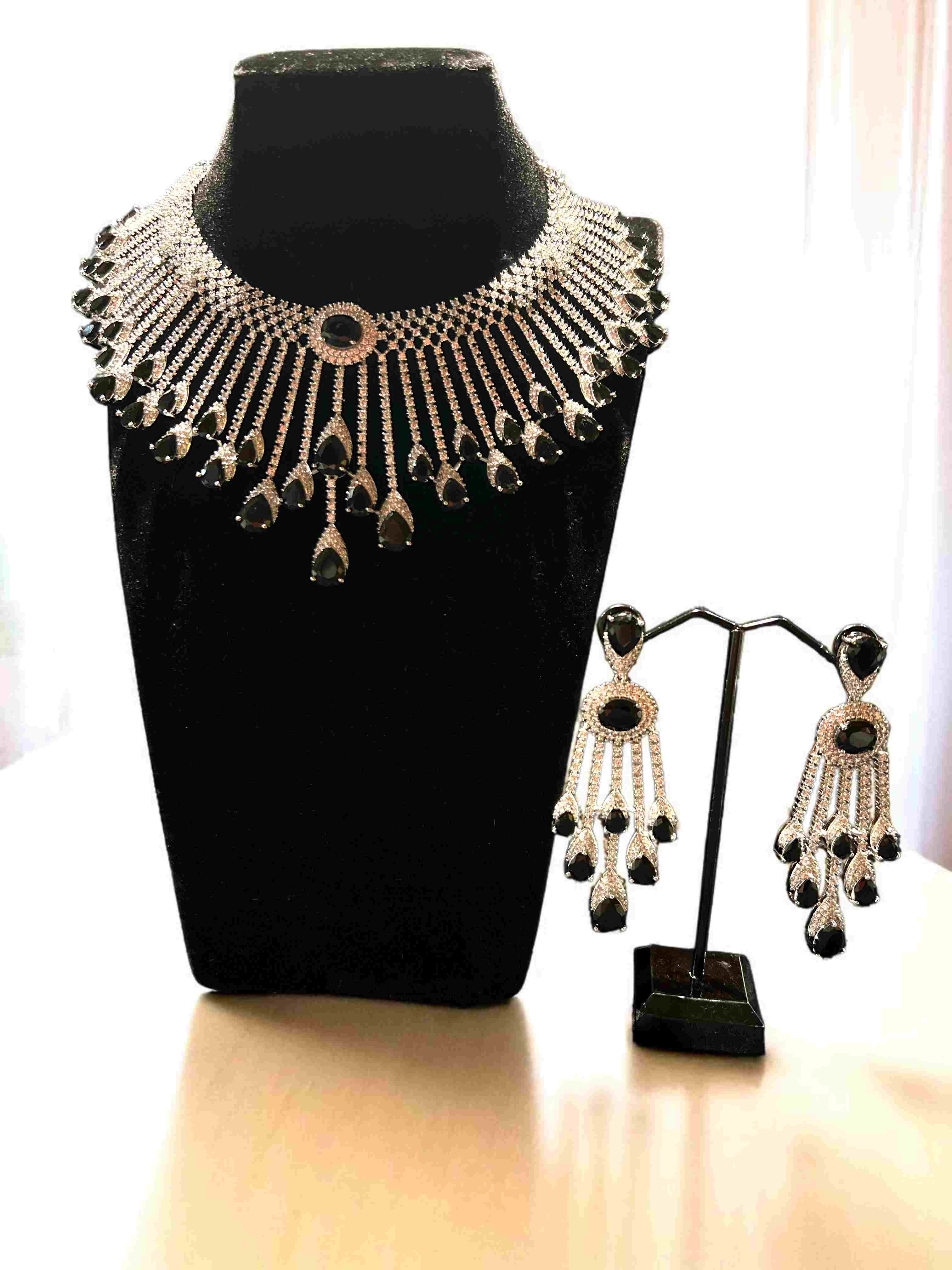 A bold and elegant choker and earring set featuring deep black teardrop stones framed by shimmering crystals. With its radiant fan-style design and striking contrast, this set is perfect for evening wear, parties, or special occasions. Adjustable and lightweight for a flawless fit.