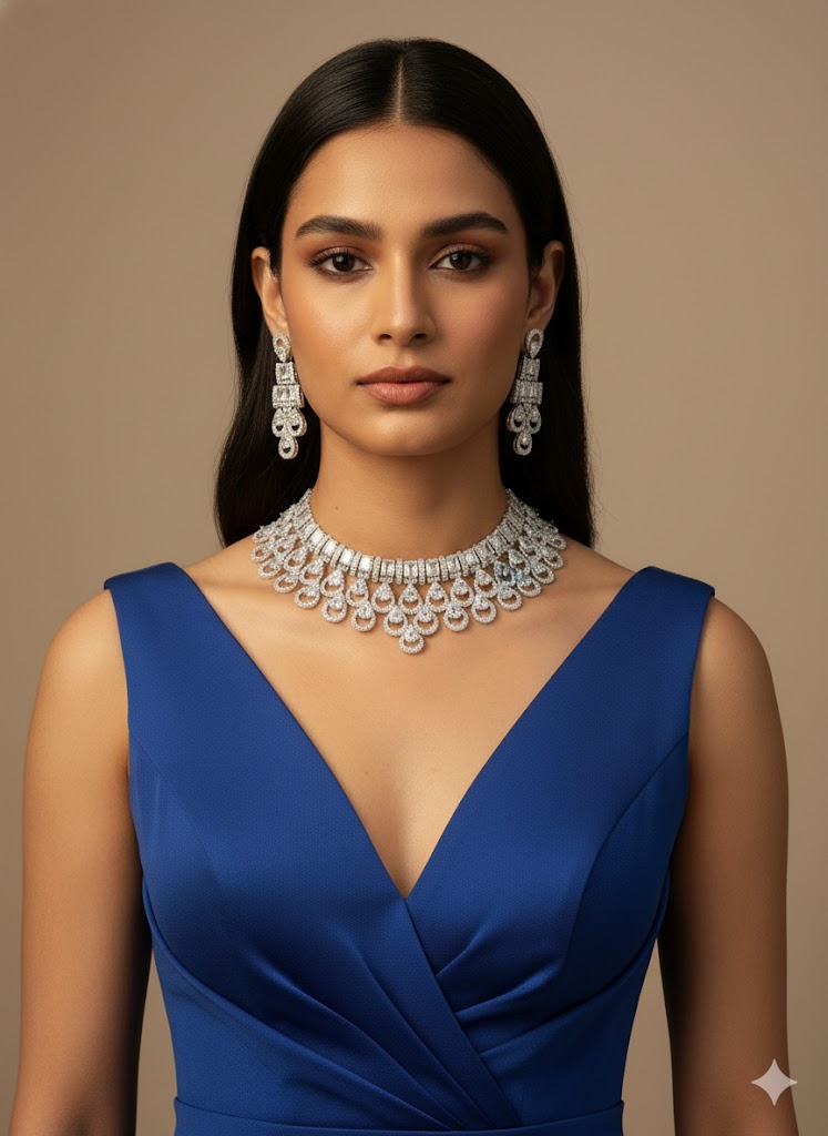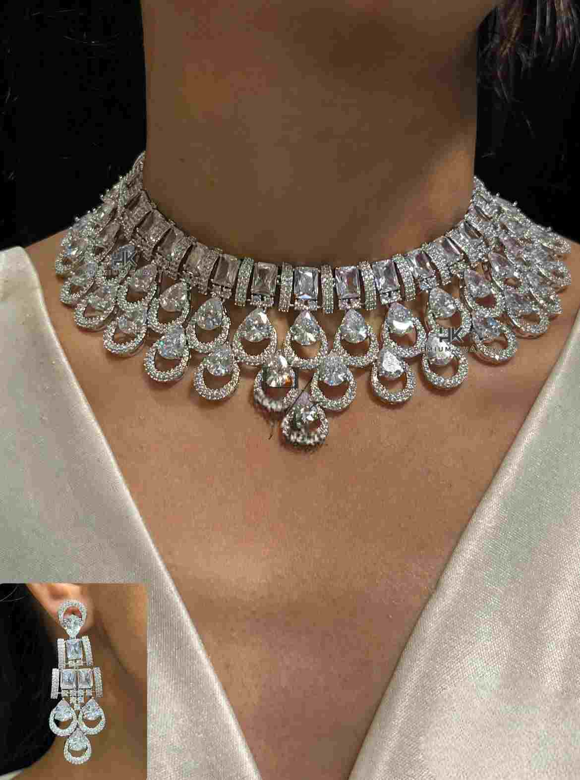 This luxurious jewelry set features a stunning necklace and matching earrings. The necklace is adorned with large, rectangular diamonds, cascading into multiple rows of teardrop-shaped diamonds, each encircled by smaller diamonds for added brilliance. The matching earrings mirror the design of the necklace, with rectangular diamonds leading to teardrop-shaped diamonds, creating a cohesive and elegant look. This set is perfect for special occasions, adding a touch of sophistication and glamour to any outfit.