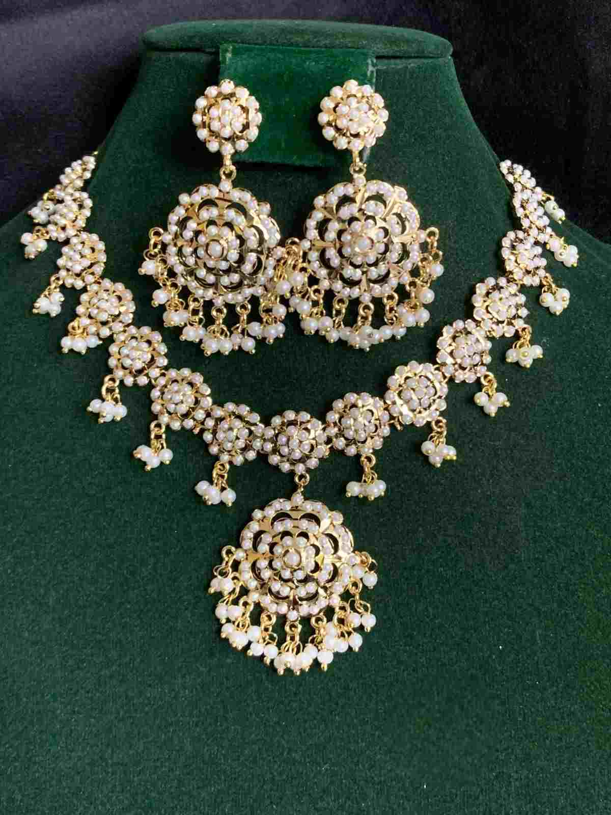This exquisite jewelry set features a beautifully crafted necklace and matching earrings, perfect for a traditional Indian bridal look. The set is intricately designed with gold plating and adorned with delicate white pearls arranged in floral patterns. The necklace showcases a series of elegant floral motifs connected by gold links, culminating in a larger central pendant with dangling pearl embellishments. The matching earrings mirror the necklace's design, featuring a smaller floral motif at the top and a larger, more elaborate floral design below, also adorned with dangling pearls. This set is ideal for weddings and special occasions, adding a touch of elegance and traditional charm to any bridal outfit.