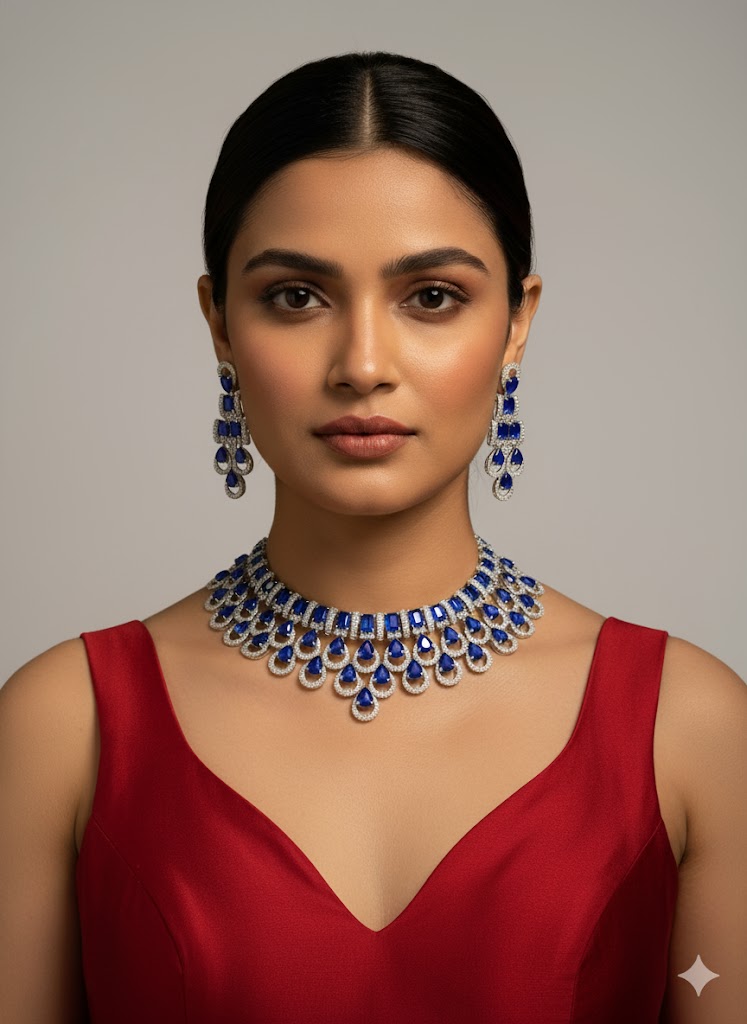 This exquisite choker set features a stunning combination of large, deep blue gemstones, likely sapphires, set in a pattern of alternating rectangular and teardrop shapes. Each gemstone is surrounded by a halo of small, sparkling diamonds, enhancing the overall brilliance and elegance of the piece. The matching earrings are designed with a similar motif, featuring a combination of rectangular and teardrop-shaped blue gemstones, also surrounded by diamonds. This set is ideal for formal occasions and adds a touch of sophistication and glamour to any outfit.