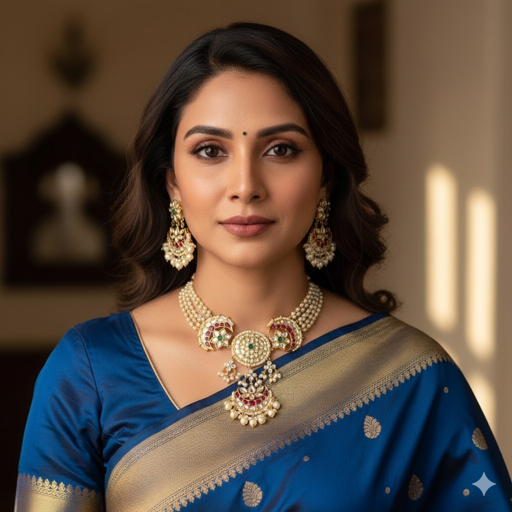 A stunning handcrafted choker featuring intricate Kundan work with ruby, emerald, and pearl detailing. Highlighted by crescent and floral motifs, this elegant set includes matching earrings—perfect for weddings, festivals, and special occasions.