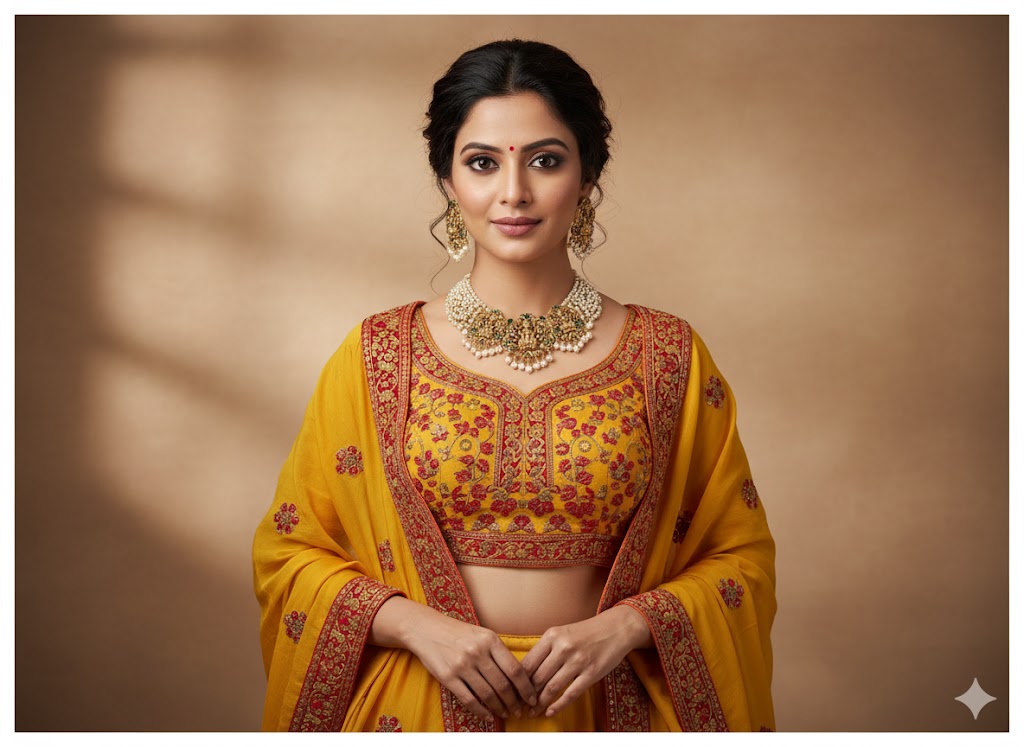 This elegant necklace set features intricate gold detailing with delicate pearl clusters and green accents, creating a timeless, regal look. The matching earrings complement the necklace with graceful motifs and pearl embellishments. Perfect for traditional occasions, this set blends heritage and sophistication effortlessly.
