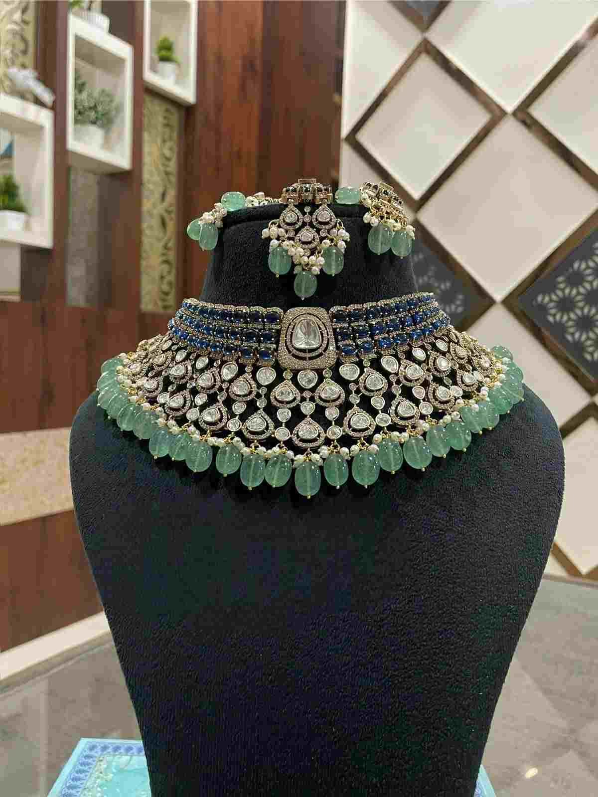 A regal choker necklace adorned with dazzling diamonds, deep blue sapphires, and vibrant emerald beads. Paired with matching earrings, this set exudes sophistication and elegance?perfect for grand celebrations and special occasions.