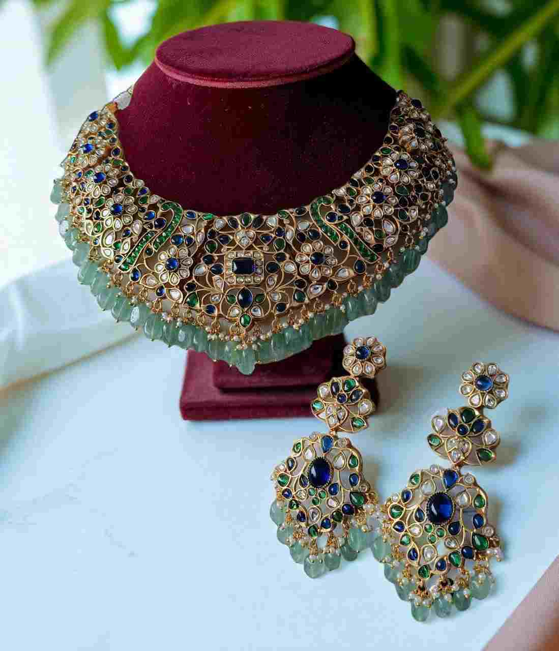 This magnificent choker necklace and earring set embodies regal elegance with its intricate Jadau Kundan craftsmanship. The design features a stunning array of deep royal blue and rich emerald green stones, interspersed with sparkling white uncut (polki-style) stones, all set within a radiant gold-toned framework. The lower edge of both the necklace and earrings is adorned with delicate drops of pale green beads, possibly jade or prehnite, adding a soft yet luxurious cascade. Small pearl accents enhance the opulent detailing. This set is a captivating statement piece, perfect for grand occasions and sophisticated traditional ensembles.