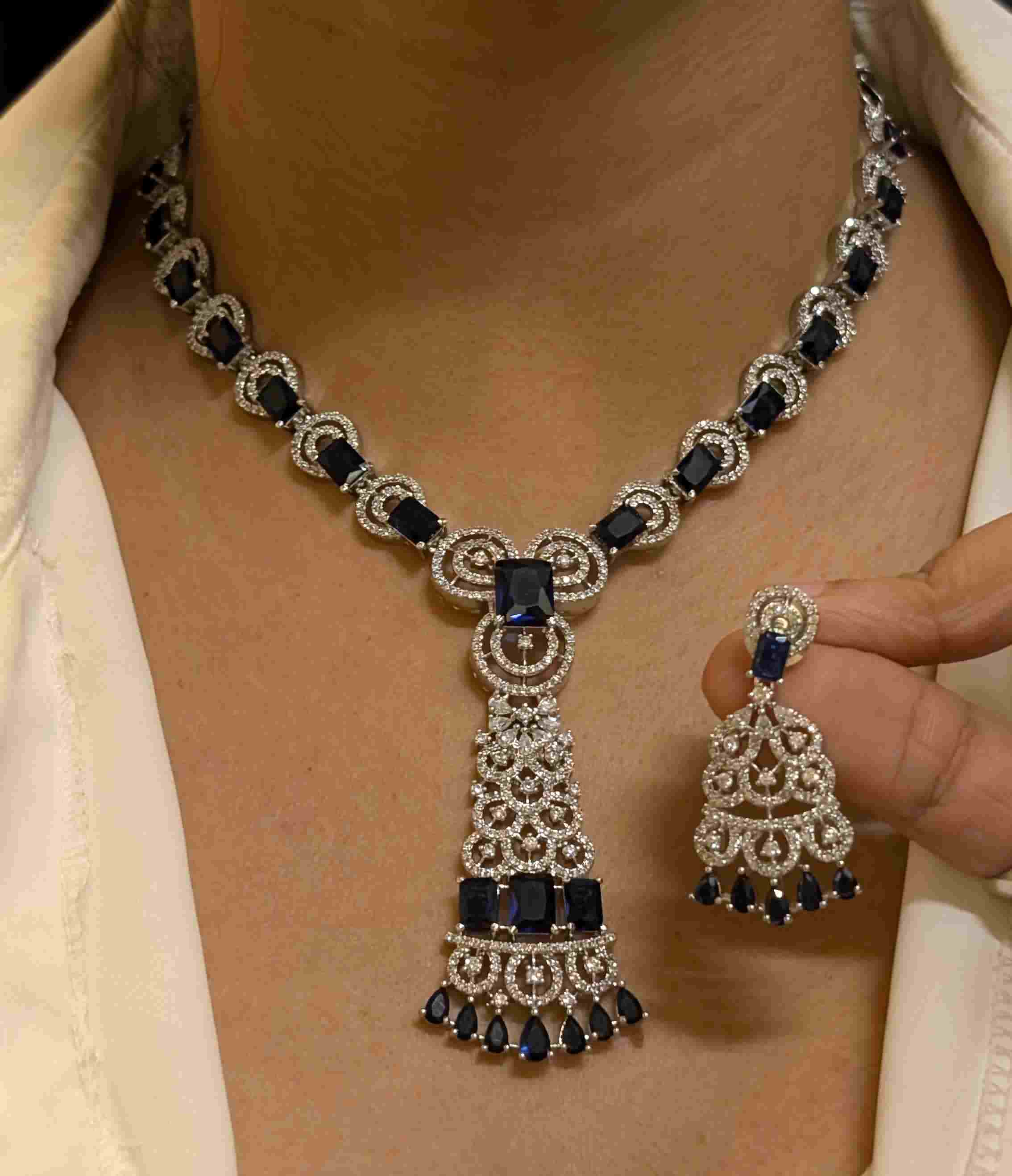 This exquisite jewelry set features a stunning necklace and matching earrings. The necklace is adorned with alternating square-cut sapphires and intricate diamond-encrusted loops, culminating in a pendant with a cascading design of diamonds and sapphires. The earrings mirror the pendant''s design, with a central sapphire surrounded by diamonds and a similar cascading pattern. The combination of deep blue sapphires and sparkling diamonds creates a luxurious and elegant look, perfect for special occasions.