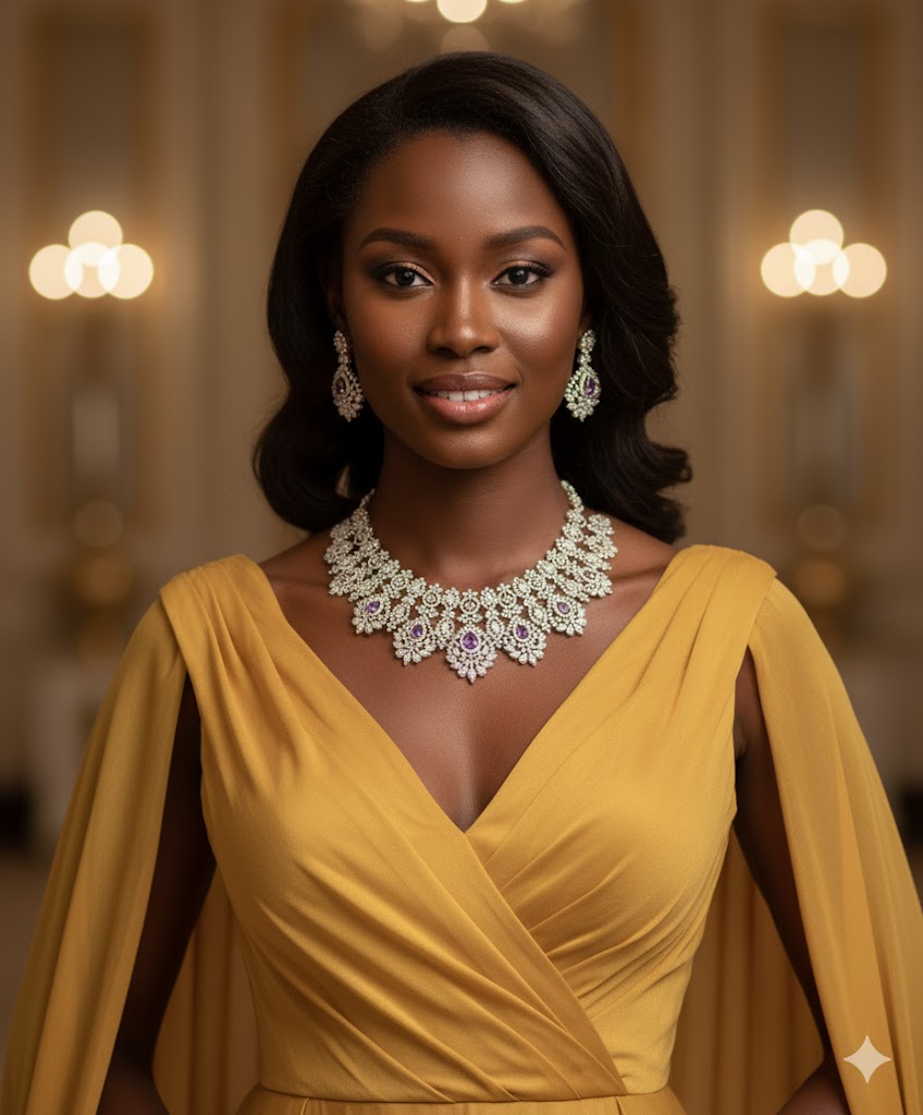 This breathtaking choker necklace set features a dazzling floral design encrusted with high-quality cubic zirconia (CZ) stones. The intricate craftsmanship is highlighted by teardrop-shaped amethyst-colored gemstones, adding a royal touch to the piece. The necklace is designed to sit gracefully on the neck, making it a perfect statement accessory. The matching earrings mirror the floral elegance of the necklace, completing the set beautifully. Ideal for weddings, formal events, and grand celebrations, this jewelry set brings luxury and sophistication to any outfit.