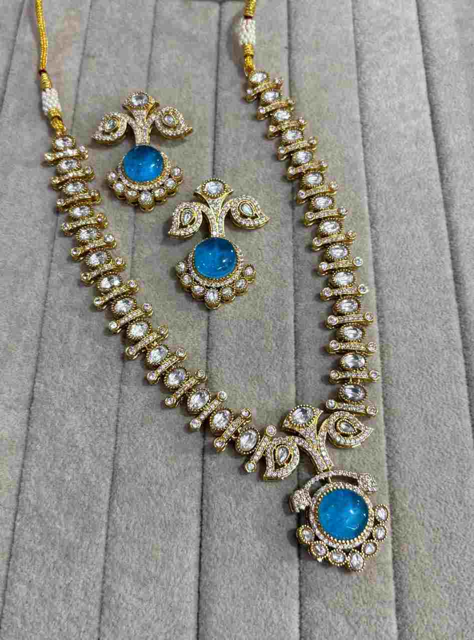 A stunning design featuring a vibrant blue gemstone centerpiece highlighted with intricate Kundan and diamond-style detailing. Paired with matching earrings, this elegant set is perfect for weddings, festive occasions, and cultural celebrations?adding a touch of sophistication and royal charm to your look.