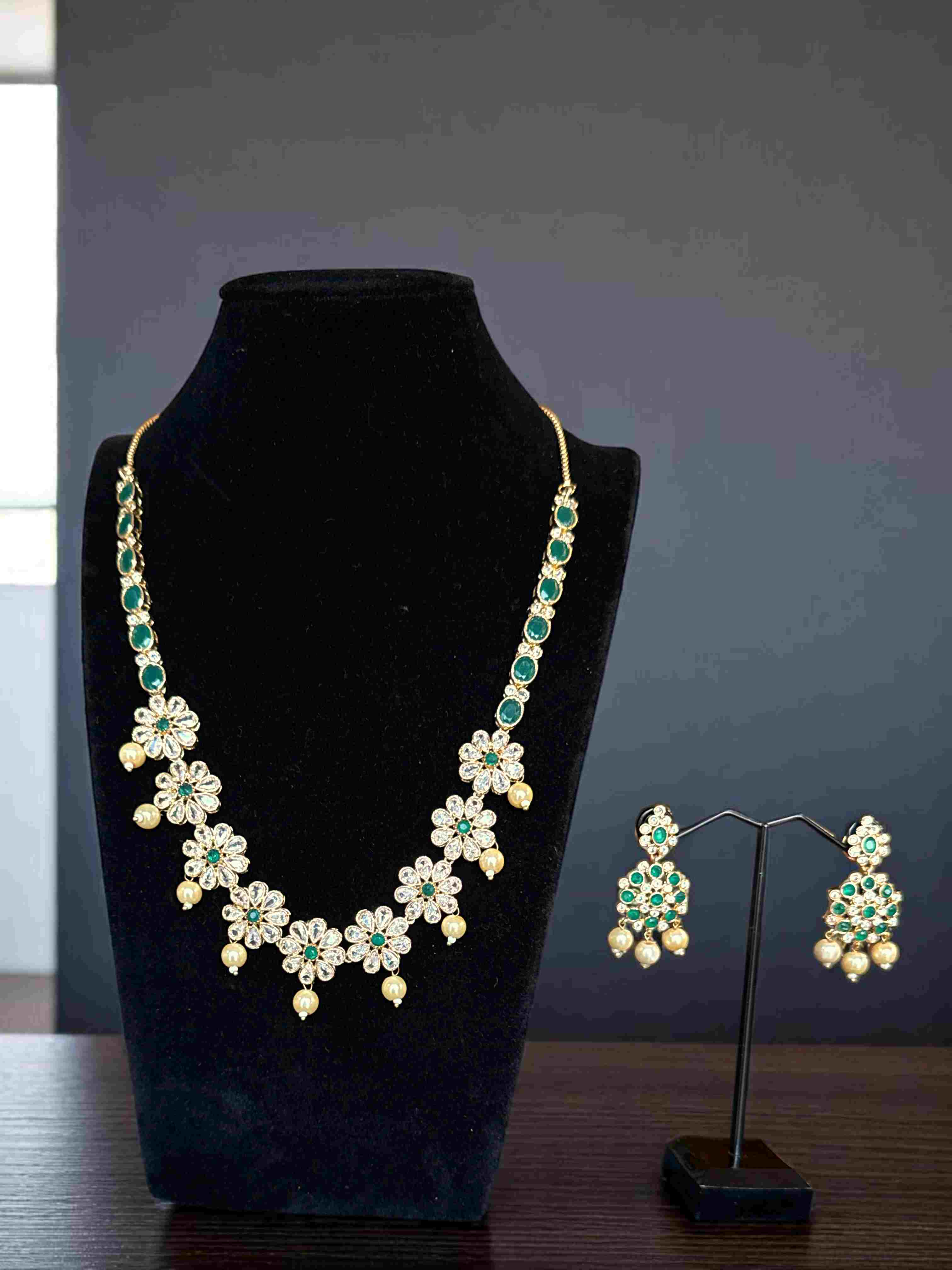 This stunning gold polish necklace features intricately designed flowers adorned with sparkling CZ stones and vibrant green stones. The flowers are further enhanced by delicate pearls hanging gracefully at the bottom, creating a captivating and elegant effect. The necklace is accompanied by matching earrings, completing the ensemble with a cohesive and refined look. Elevate your style with this exquisite jewelry set, perfect for formal events or special occasions where you want to make a statement with your accessories. The combination of the gold polish, CZ and green stones, and the added touch of pearls, creates a luxurious and sophisticated design that is sure to turn heads.