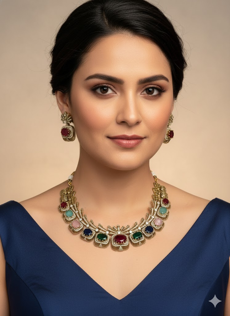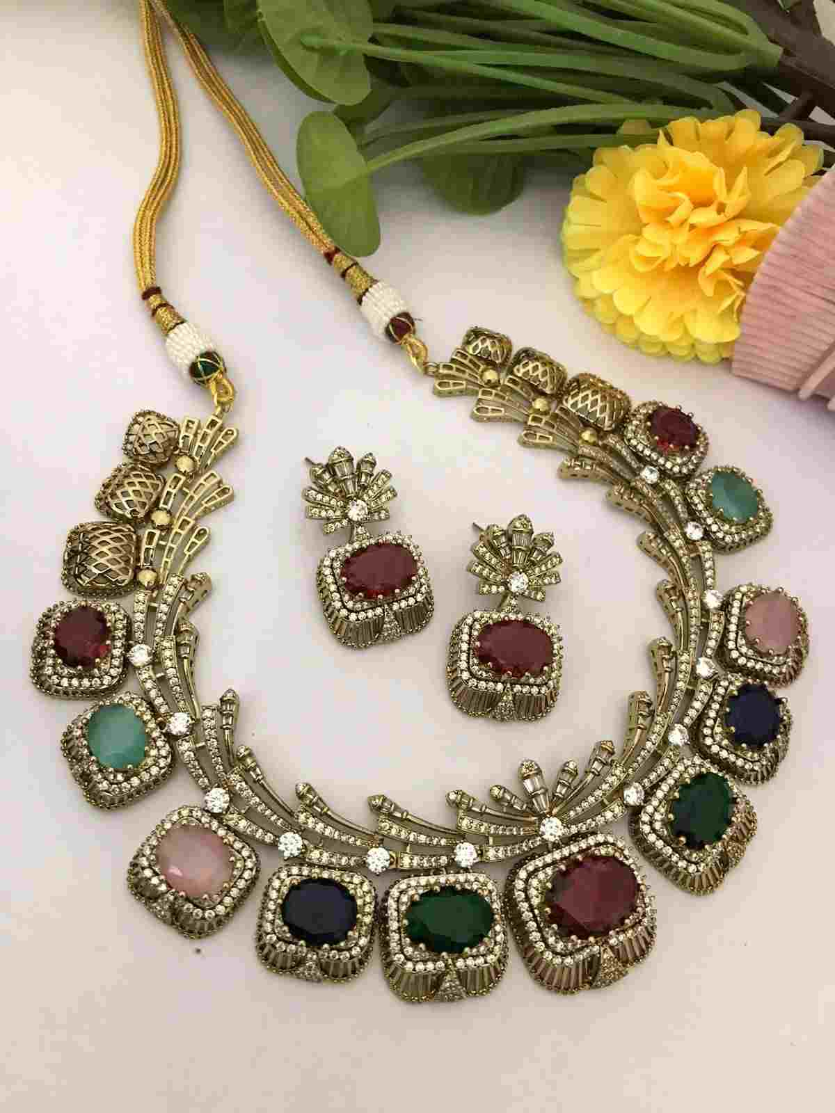 This traditional Indian jewelry set features an elaborate necklace and matching earrings. The necklace showcases a series of ornate gold-toned designs, each embedded with a vibrant array of gemstones, including red, green, blue, and pink stones. These gemstones are encased within intricate patterns and surrounded by smaller sparkling stones, creating a dazzling effect. The necklace is completed with a yellow and white braided cord, adding to its traditional appeal. The matching earrings mirror the design of the necklace, incorporating similar gemstones and detailed metalwork. This set is ideal for special occasions and cultural events, offering a rich and luxurious look.