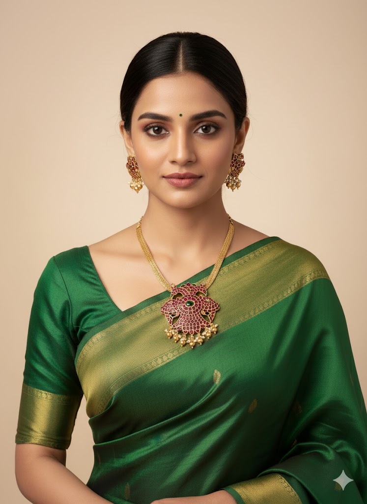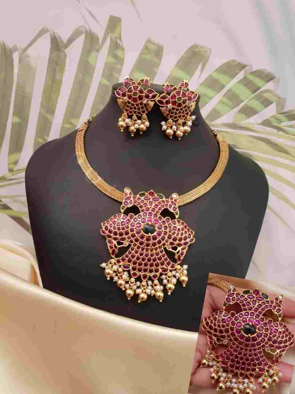 This traditional jewelry set consists of a necklace and matching earrings. The necklace features an intricate design with a large pendant adorned with red and green stones and small pearl-like beads hanging from the bottom. The matching earrings mirror the pendant's design with red stones and pearl-like beads. The jewelry is gold-plated, giving it a rich and elegant appearance. Displayed on a black mannequin bust with a background of green leaves, this set is ideal for traditional occasions and adds a touch of elegance to any outfit. Additionally, there is a close-up of the pendant held in a hand, highlighting the detailed craftsmanship.