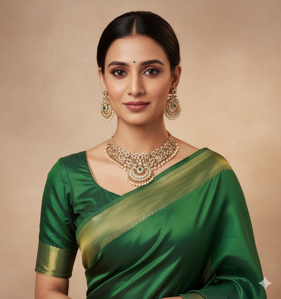 This traditional Indian bridal jewelry set consists of a choker necklace and matching earrings. The jewelry is intricately designed with gold plating, adorned with white pearls, and studded with green and red gemstones. The necklace features a detailed floral and paisley pattern with a central pendant that matches the design of the earrings. The earrings are chandelier-style, with a similar floral motif and pearl drops. This luxurious set is perfect for special occasions, particularly weddings, adding a touch of elegance and tradition to any bridal attire.