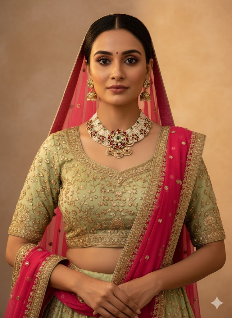 An opulent bridal set featuring a pearl-adorned necklace with intricate floral motifs, accented by rich red and green gemstones. Paired with matching earrings, this set exudes timeless elegance?perfect for weddings and grand occasions.
