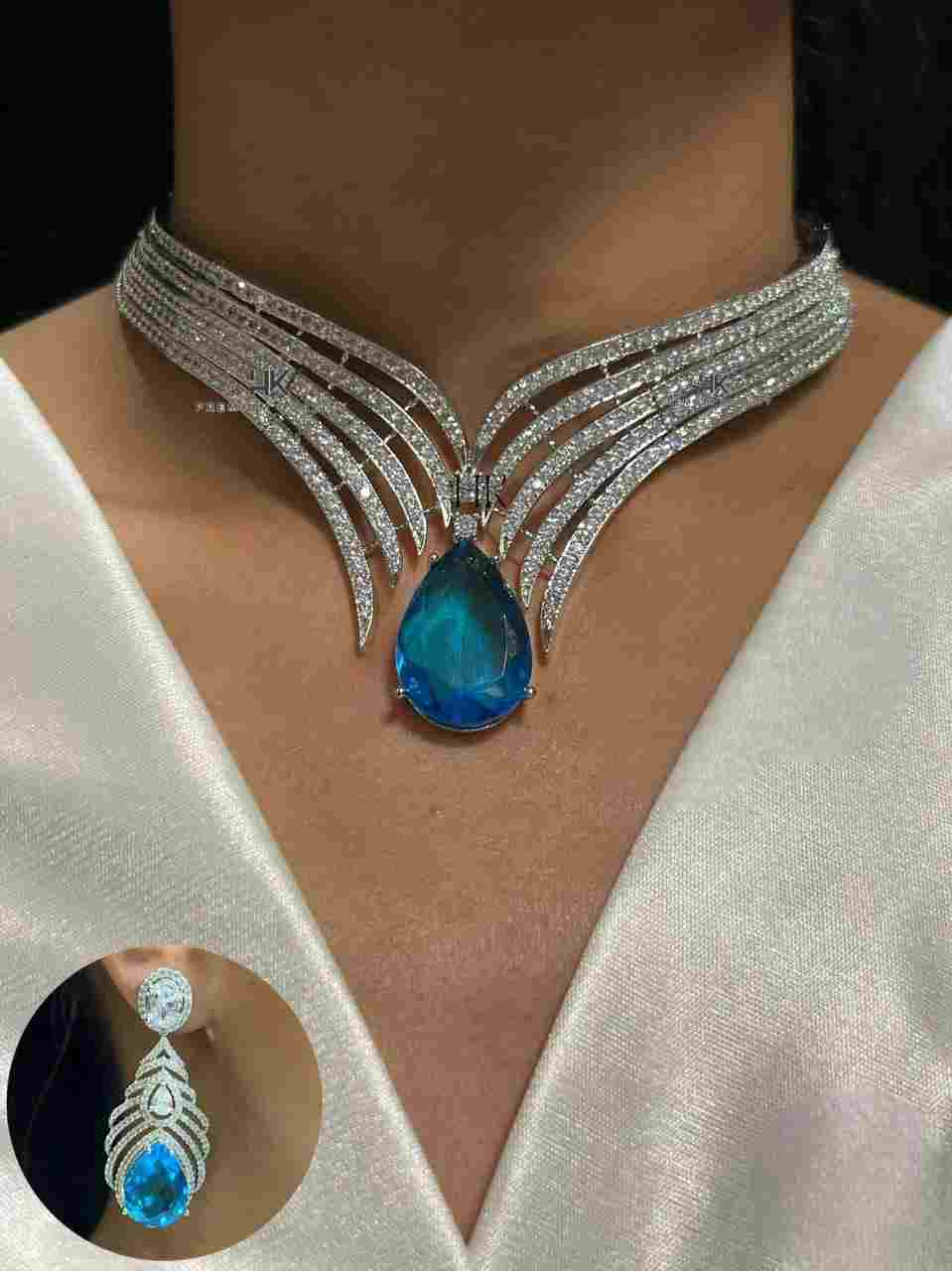 Make an unforgettable statement with this exquisite and modern choker necklace and matching earring set. The choker features a dazzling winged design, meticulously adorned with brilliant diamond-like cubic zirconia stones set in a rhodium-plated finish, ensuring maximum sparkle. A magnificent, deep blue pear-cut gemstone, resembling a Swiss or London Blue Topaz, dangles gracefully as the central focal point of the necklace. The accompanying dangle earrings elegantly mirror the winged motif and showcase a matching vibrant blue pear drop, completing this sophisticated and luxurious ensemble. Perfect for glamorous evening events, galas, and any occasion demanding a show-stopping accessory.