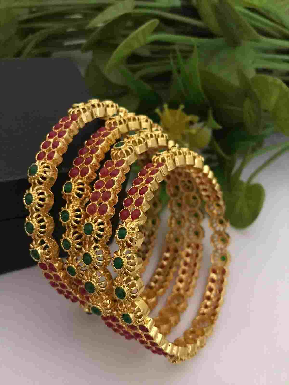 These exquisite bangles are gold-plated and feature a detailed, intricate pattern with alternating red and green stones embedded in a floral design. The clusters of red stones and central green stones in each floral motif create a vibrant and traditional look. The gold plating adds a touch of elegance, making these bangles perfect for festive occasions or traditional attire. The craftsmanship and rich colors celebrate heritage and add a luxurious touch to any outfit.