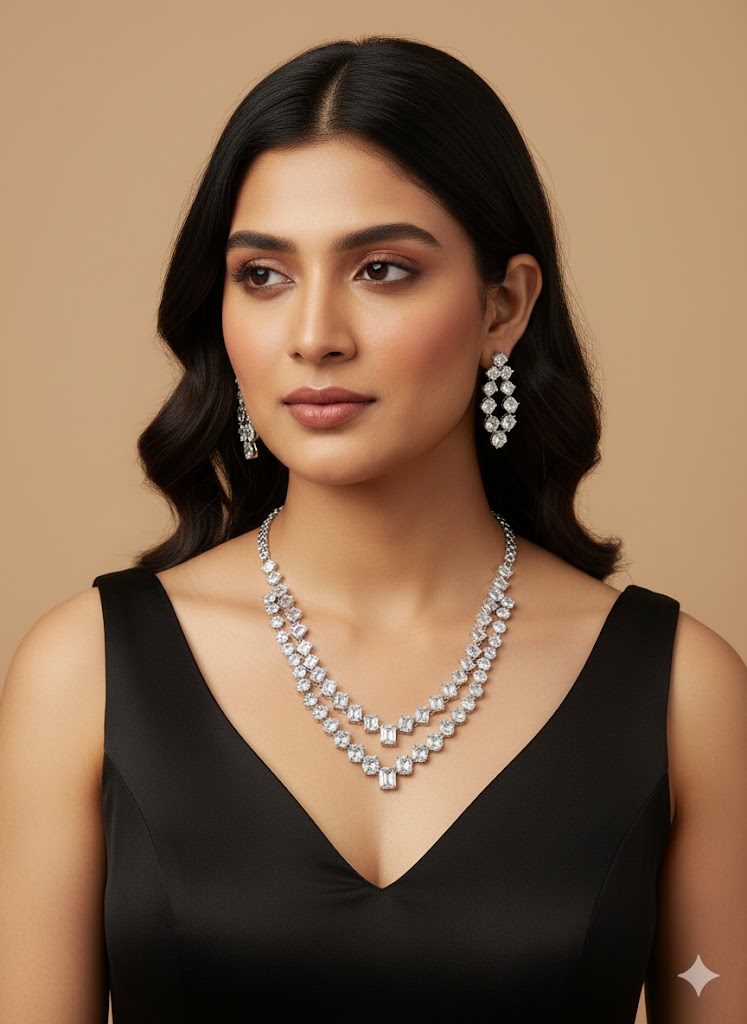 This luxurious jewelry set consists of an elegant necklace and a pair of matching earrings. The necklace features three rows of alternating round and rectangular cut clear gemstones, meticulously set in a high-quality silver or white gold metal. The intricate design and the sparkling gemstones create a captivating and sophisticated look. The matching earrings complement the necklace perfectly with a similar design of alternating round and rectangular cut clear gemstones. This set is ideal for formal occasions, adding a touch of glamour and refinement to any outfit.