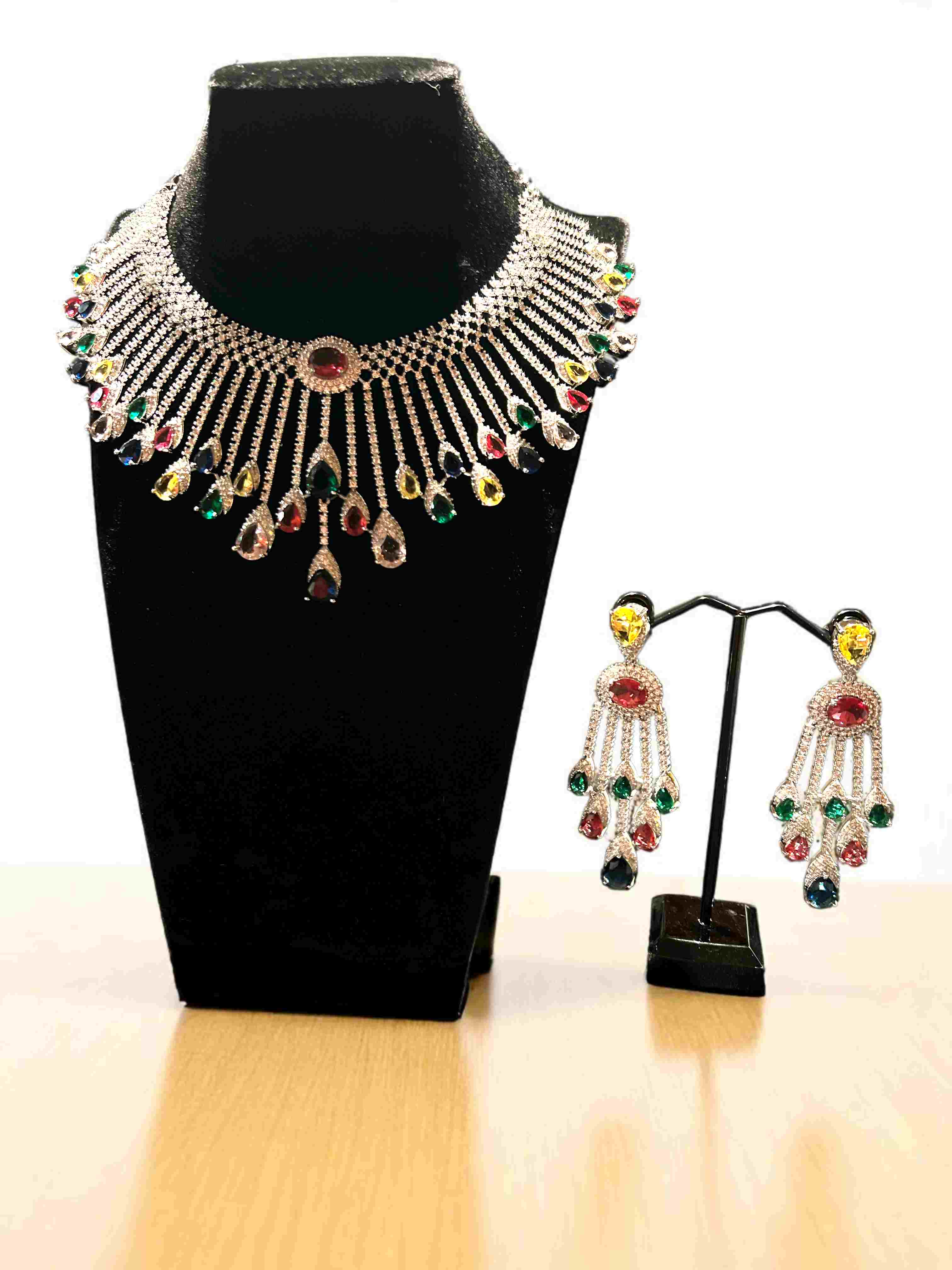 Celebrate elegance and color with this striking jewelry set, featuring a beautifully crafted necklace and matching earrings. The necklace showcases a fan-like arrangement of teardrop-shaped gemstones in a stunning palette of red, mint, blue, yellow, and pink. A prominent red gemstone at the center enhances its captivating design, all set in radiant silver-tone metal. The earrings mirror the colorful splendor of the necklace, with dangling multicolored gemstones and a yellow teardrop gem at the top for added charm. Perfect for galas, weddings, or festive occasions, this set brings a pop of vibrant sophistication to any outfit!