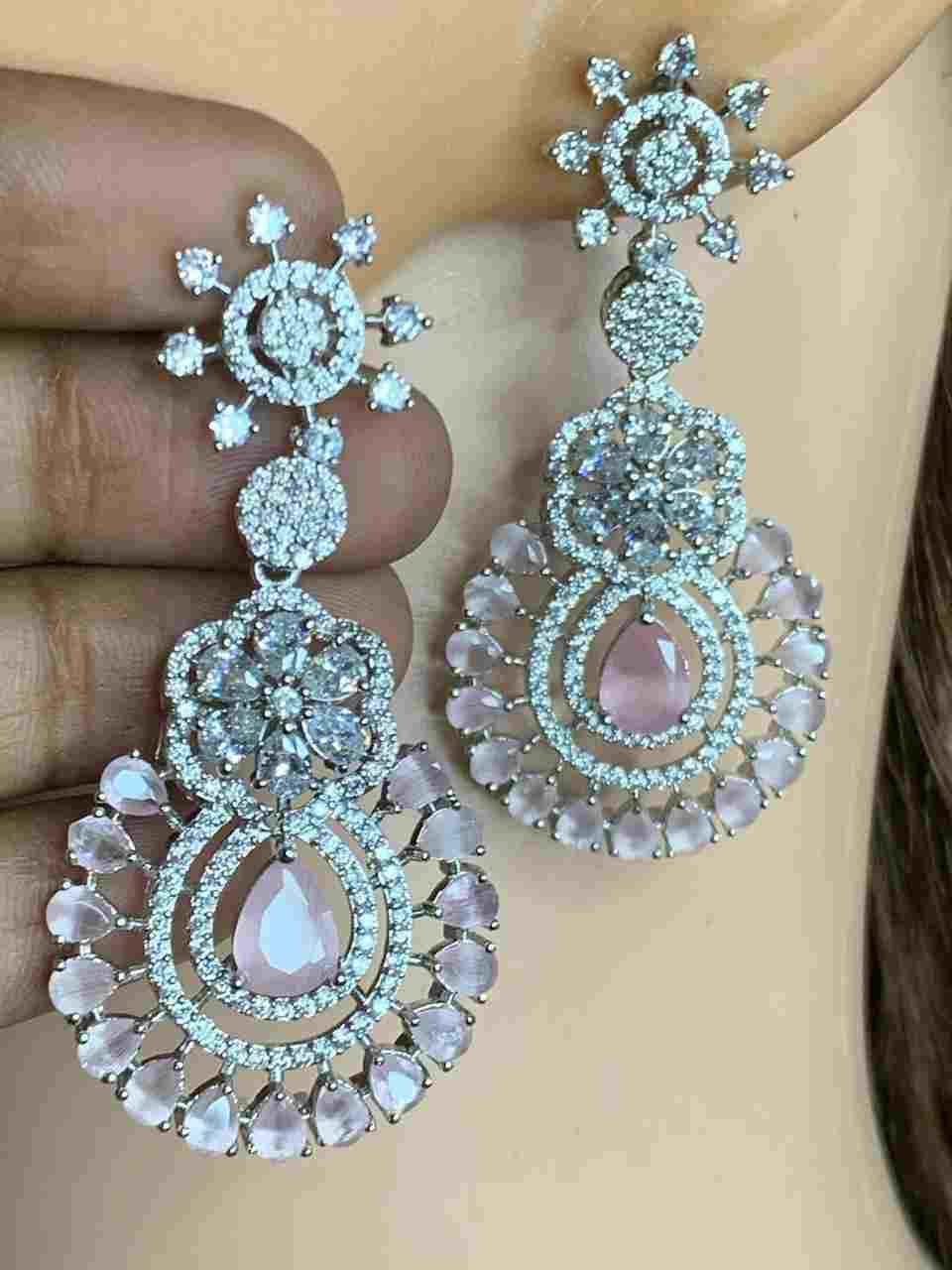 These exquisite chandelier earrings feature a radiant floral-inspired stud, adorned with a mix of sparkling round and marquise-cut simulated diamonds. A pave-set circular accent connects to a graceful, multi-layered drop, showcasing a central pear-shaped Rose Pink Floral & Teardrop Chandelier Earrings gemstone encircled by a double halo of brilliant simulated diamonds. The outer frame is adorned with a border of delicate, smaller pear-shaped diamond gemstones, adding a captivating cascade of color. Set in a gleaming rhodium plating, these earrings are perfect for making a grand statement at any elegant affair.