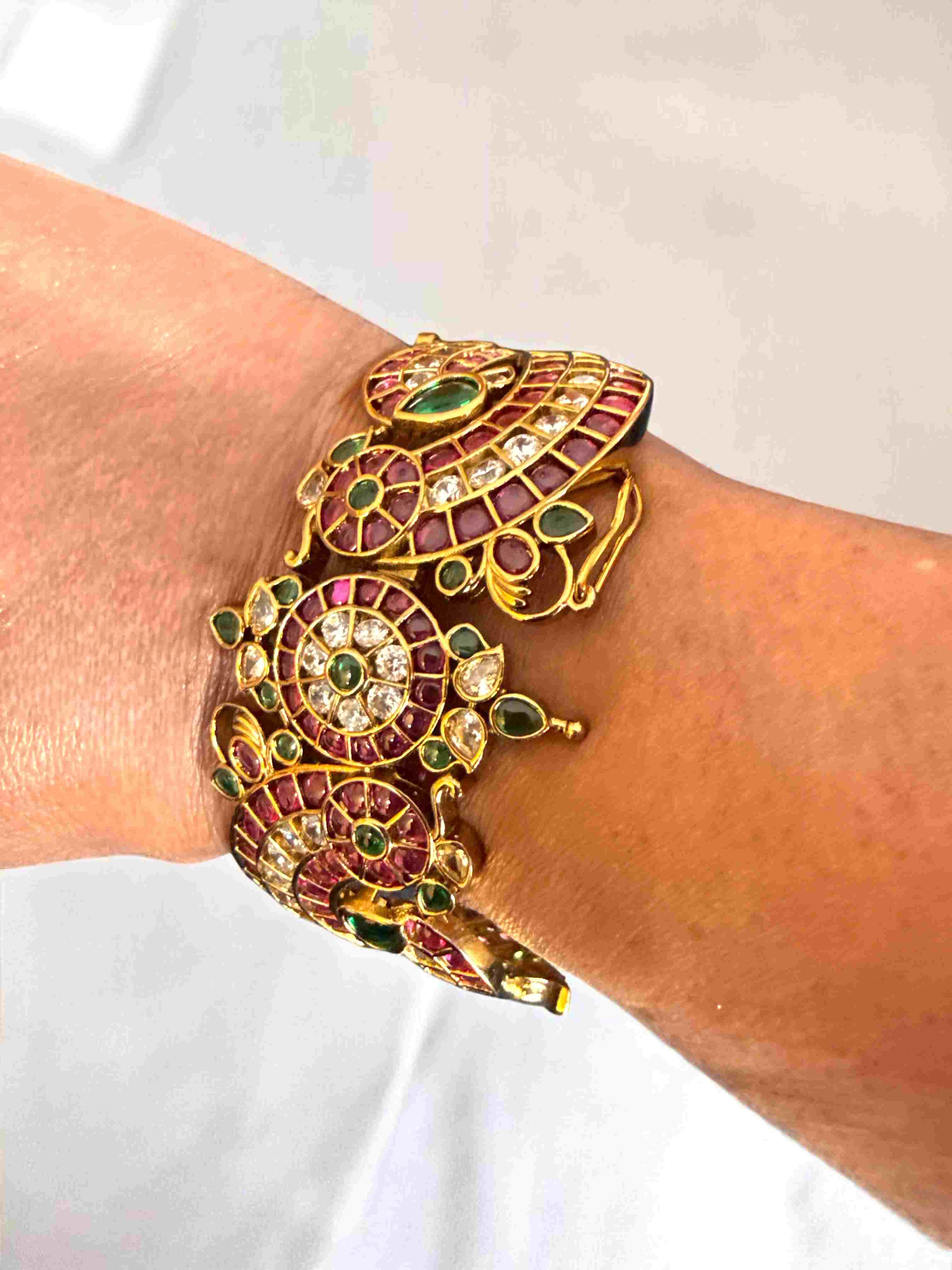 This exquisite gold-toned Kada features intricate Kundan settings showcasing vibrant ruby and emerald gemstones. The design is inspired by the majestic peacock, a symbol of beauty and grace, with detailed craftsmanship that makes it a stunning statement piece.