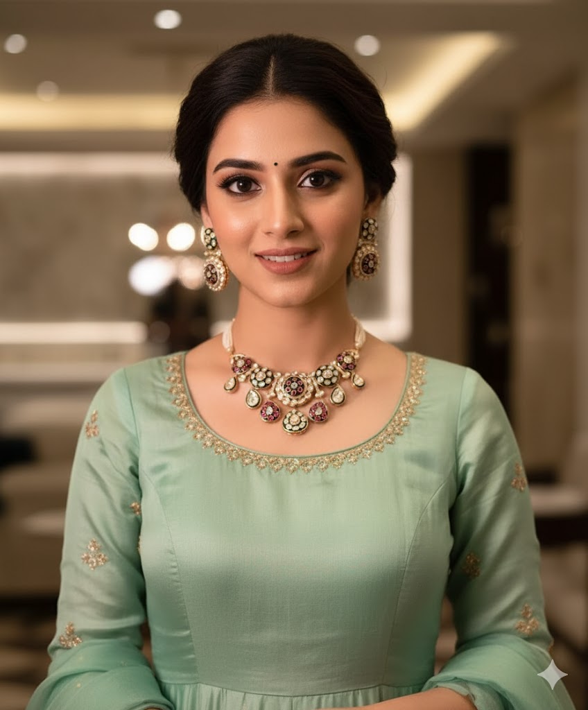 Exquisite gold-toned necklace and earring set featuring a Kundan design with vibrant ruby and green stones, accented by sparkling white stones.