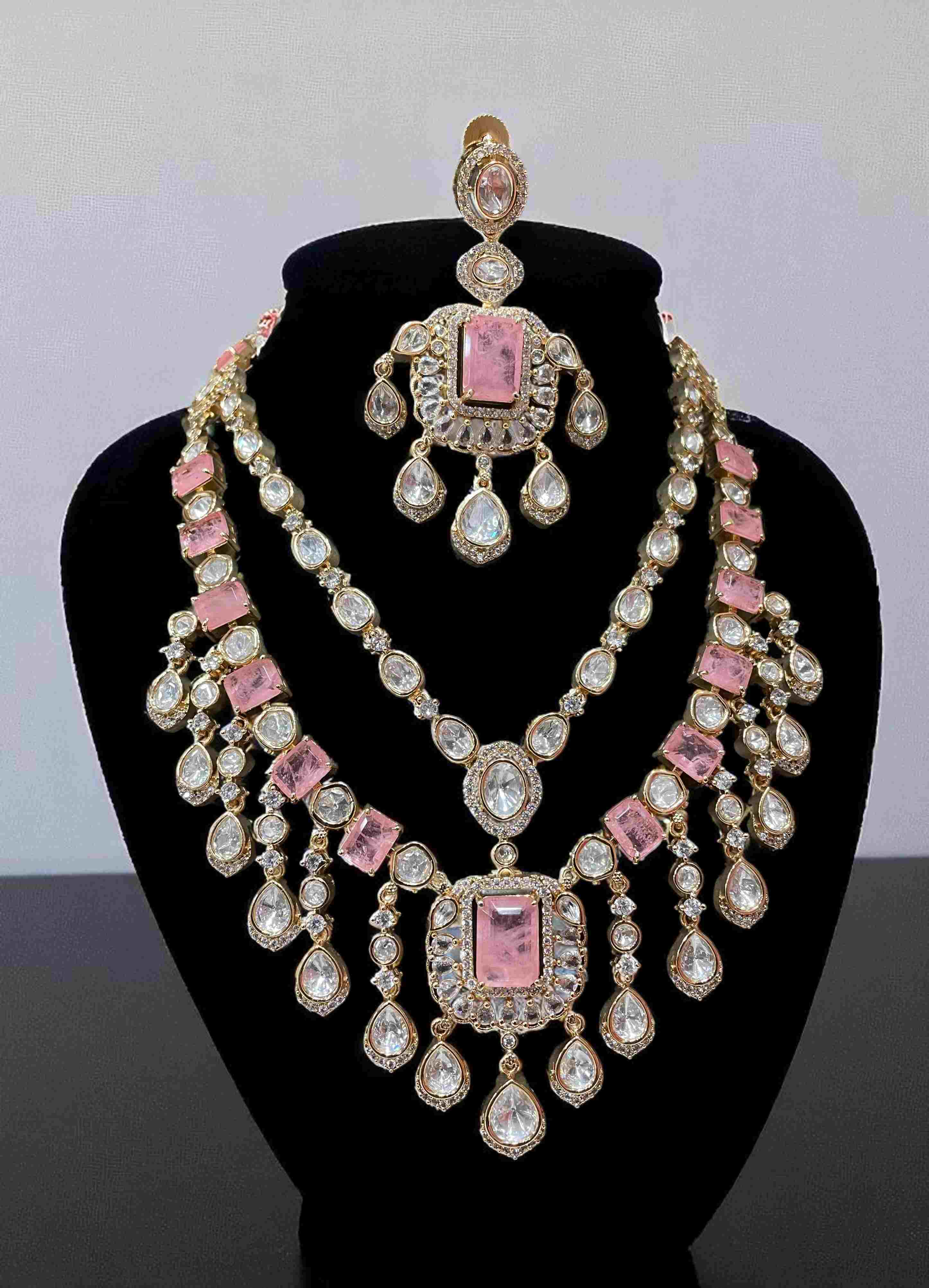 A dazzling high-quality necklace set featuring layers of sparkling polki-style stones and prominent blush pink gemstones, complete with a matching maang tikka. Perfect for a radiant and elegant look.