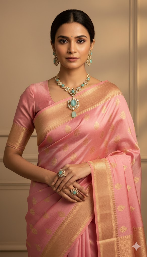 A breathtaking necklace set featuring striking turquoise-blue stones set in intricate Kundan craftsmanship, accented with radiant Moissanite brilliance. The fusion of traditional artistry and modern sparkle creates a regal masterpiece, perfect for grand occasions and timeless elegance.