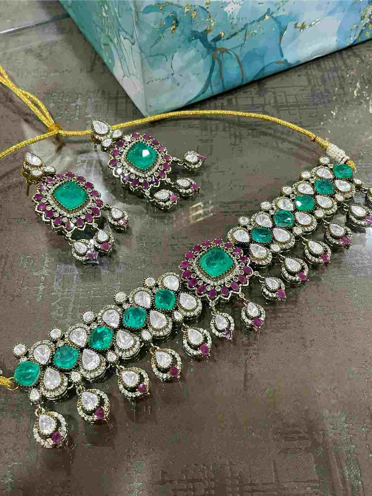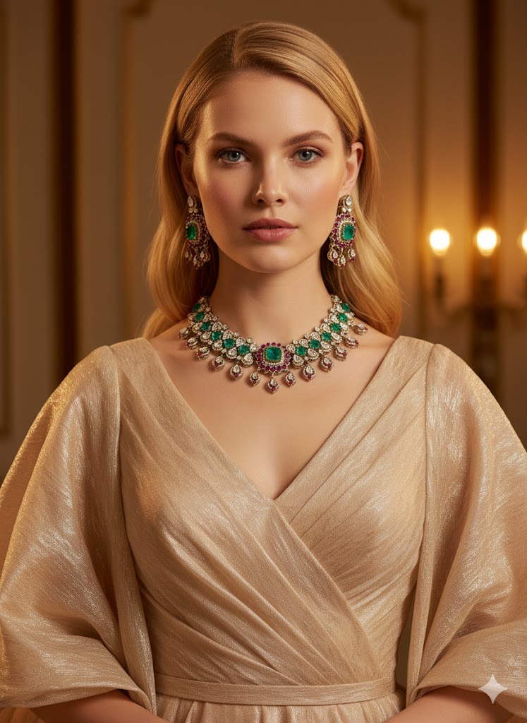 A stunning choker and earring set featuring vibrant emeralds, sparkling diamonds, and delicate ruby accents. Designed for regal elegance, this piece adds a touch of sophistication to grand celebrations and special occasions.