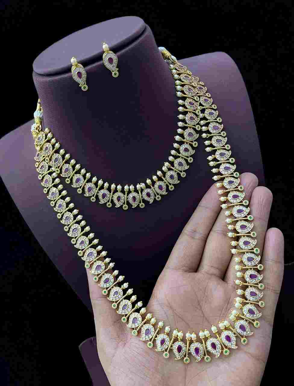 This versatile jewelry set includes two necklaces (one long, one short) and matching earrings, all featuring elegant paisley (mango) motifs. Each motif is adorned with sparkling white stones and a central ruby-red accent, complemented by small green beads and delicate pearl droplets along the chain. The matching earrings echo the paisley design with a ruby center and pearl drop. This set offers options for various necklines and is perfect for adding a touch of traditional charm to any ensemble.