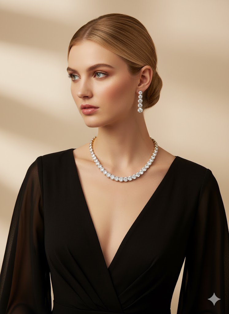 "Embrace the radiance of our Glittering CZ Gold-Plated Choker Set, a dazzling array of precision-cut cubic zirconia stones that capture the essence of luxury. The choker necklace is a masterpiece of design, featuring a single row of lustrous CZ stones, each cradled in a gold-plated setting that enhances their brilliance. Accompanied by a pair of vertically arranged CZ stone earrings, this set is a symphony of sparkle and shine. Ideal for glamorous events and celebrations, this set is available for rental, ensuring you'll be the center of attention at any sophisticated gathering."