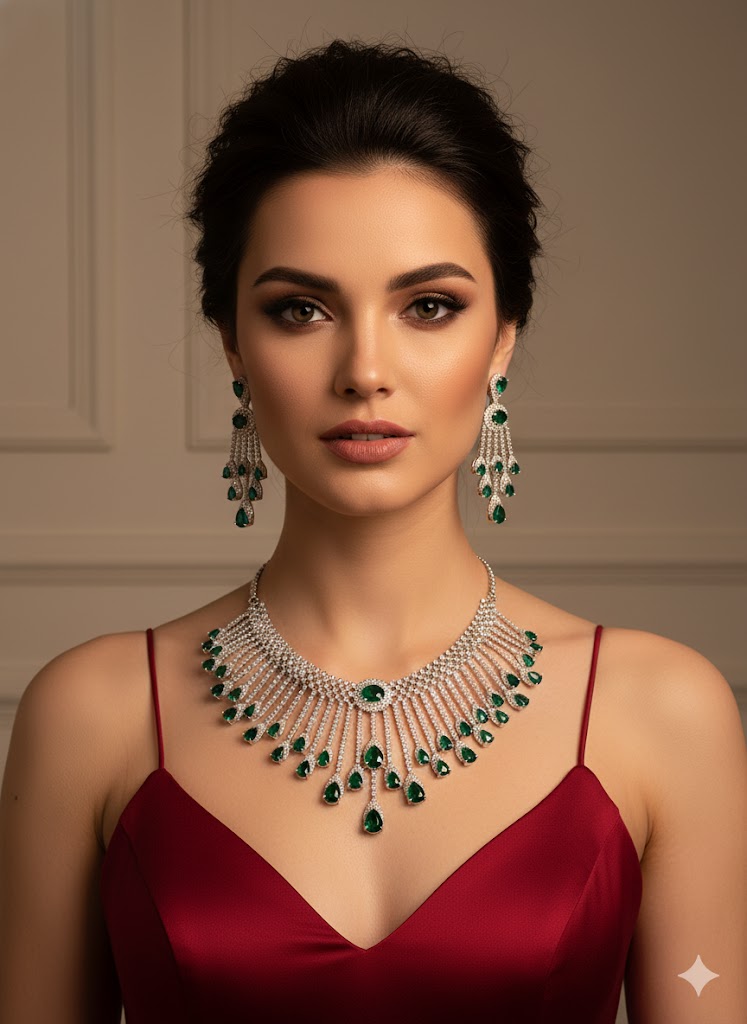 A luxurious choker and earring set adorned with rich emerald-green teardrop stones and radiant crystal accents. The fan-shaped design exudes elegance, making it an ideal choice for festive occasions, weddings, or evening events. Adjustable chain for a perfect fit and comfortable wear.