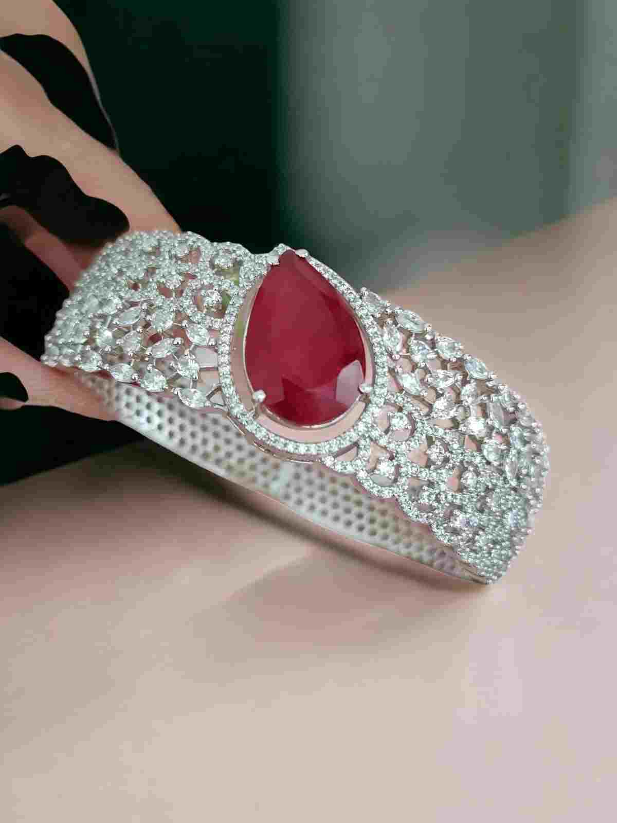 This stunning bracelet features a large, teardrop-shaped ruby as its centerpiece, surrounded by an intricate lattice of sparkling diamonds. The bracelet's band is adorned with a delicate pattern of marquise and round-cut diamonds, creating a luxurious and elegant design. Crafted with precision, this piece is perfect for special occasions or as a statement accessory. The combination of the vibrant red ruby and the shimmering diamonds makes this bracelet a truly captivating and timeless piece of jewelry.