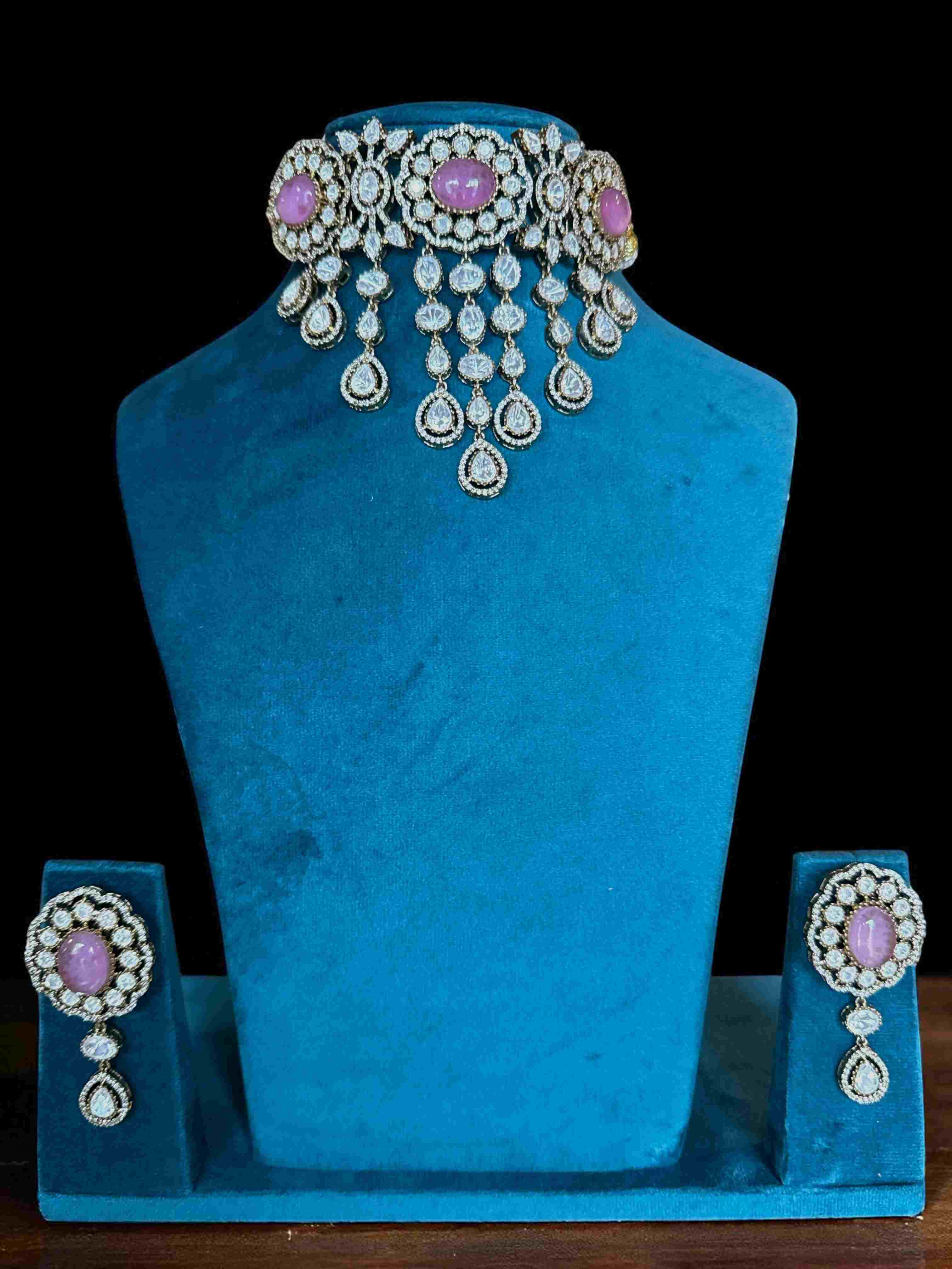 An exquisite choker set featuring radiant pink sapphire stones encircled with shimmering diamonds, enhanced by cascading drops for a regal finish. A perfect blend of sophistication and grace for weddings, receptions, and grand occasions.
