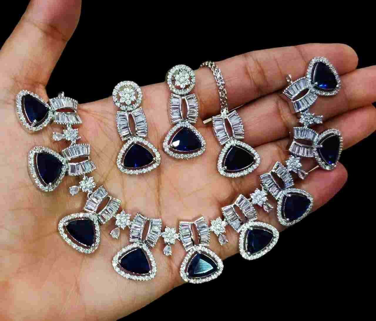 This elegant jewelry set includes a pair of earrings and a matching necklace, each featuring large, dark blue, triangular gemstones. The gemstones are set in a silver or white gold setting and are surrounded by smaller clear stones, likely diamonds, arranged in a decorative pattern. The earrings have a circular design at the top with a floral motif made of small clear stones, followed by two rectangular clear stones, and ending with the large triangular blue gemstone. The necklace consists of multiple triangular blue gemstones, each surrounded by clear stones and connected by additional clear stones in various shapes. This set is perfect for adding a touch of sophistication and glamour to any outfit.