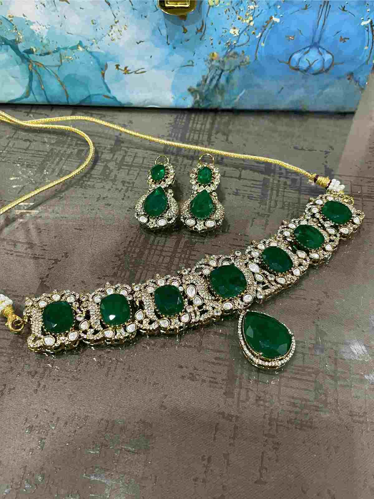 A striking choker set featuring bold emerald green stones framed with shimmering Polki Kundan detailing. Complete with matching teardrop earrings, this elegant set is perfect for weddings, receptions, and festive occasions?adding a regal and timeless charm to your ensemble.